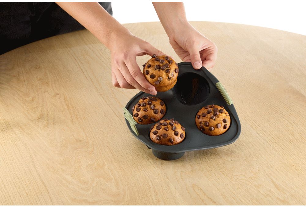 Den forstærkede bund giver ekstra stabilitet under brug og sikrer, at formen står sikkert i airfryeren. Det fleksible silikonemateriale gør det enkelt at fjerne de færdige muffins uden at beskadige dem.