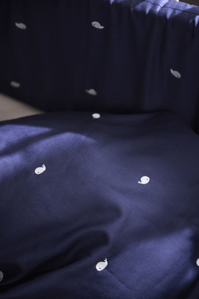 Den elegante midnight-farve skaber en rolig og harmonisk atmosfære i babyværelset, mens de sirligt broderede hvaler tilføjer en charmerende detalje, der gør sengetøjet til noget helt særligt. Designet er omhyggeligt udarbejdet med fokus på både skønhed og funktionalitet, så din baby kan nyde den bedst mulige søvn.