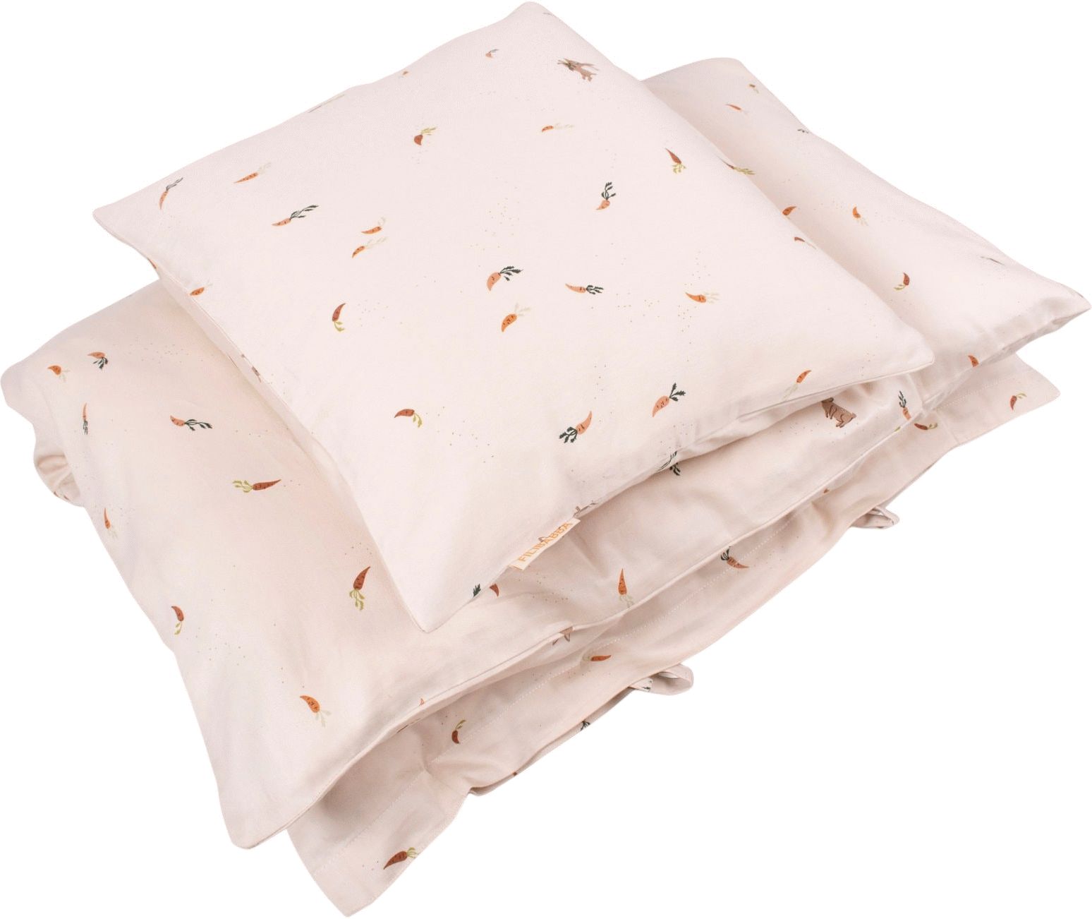 Carrot Thief-mønsteret fortæller en sød historie med livlige brune kaniner, der springer rundt mellem fine orange gulerødder på en cremet baggrund. De små kaniner har stjålet gulerødder og løber af sted med deres bytte i munden, hvilket skaber et charmerende og eventyrligt udtryk. Printet er designet, så motiverne vender i alle retninger, hvilket sikrer, at sengetøjet altid ser perfekt ud, uanset hvordan det placeres.