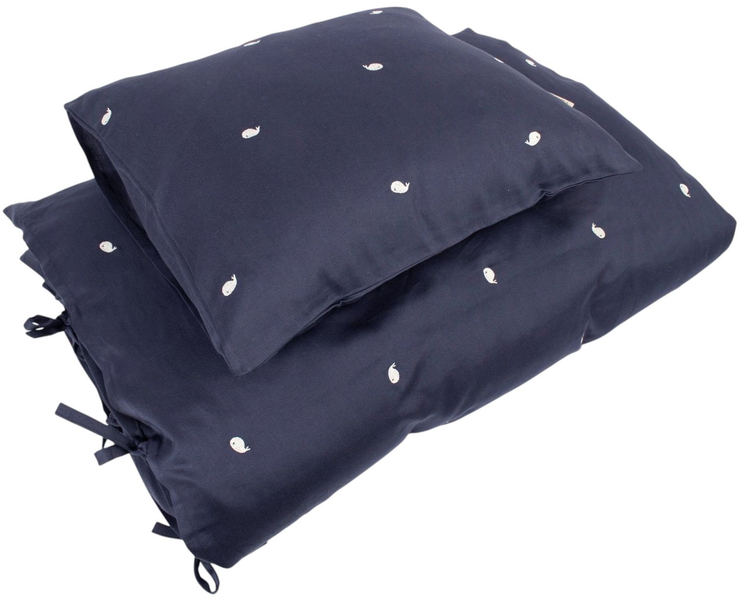 Det luksuriøse sengesæt er fremstillet i 100% GOTS-certificeret økologisk bomuld, som sikrer både bløde nætter og en bæredygtig tilgang til børnetekstiler. De sirligt broderede hvaler på forsiden skaber et poetisk udtryk, mens bagsiden holdes i en ensfarvet nuance for optimal sovekomfort uden forstyrrende tekstur mod huden.