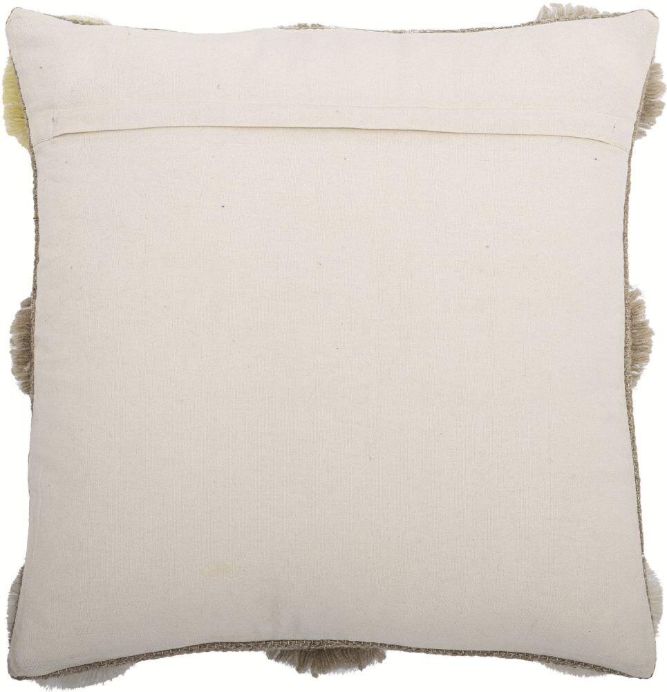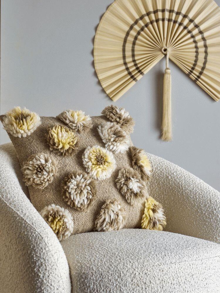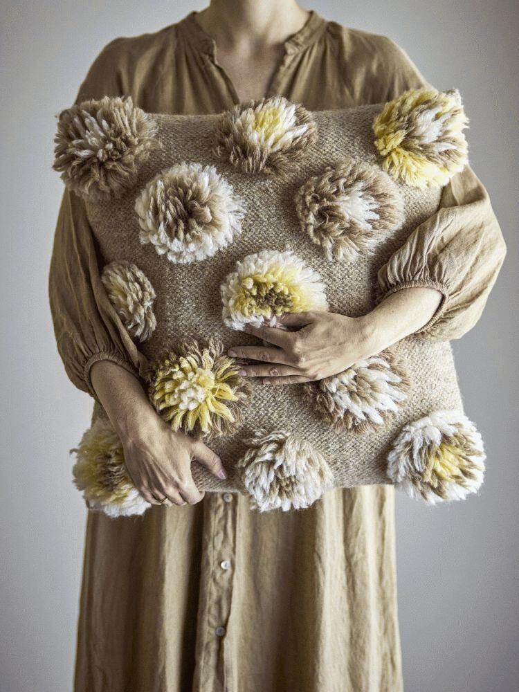 Puden er fremstillet i uld, et naturligt materiale kendt for sin bløde tekstur og evne til at tilføre en behagelig fornemmelse. Forsiden præsenterer et tuftet, vævet design, der giver puden en tredimensionel overflade med dybde og karakter. De dekorative pomponer i nuancer af gul, beige og hvid skaber et levende udtryk, der fanger øjet uden at være overvældende. Farvepaletten er omhyggeligt sammensat for at passe ind i både moderne og klassiske indretningsstile.