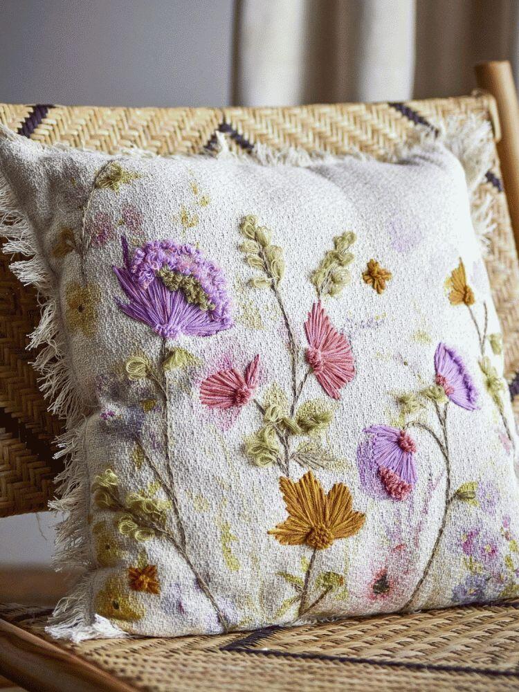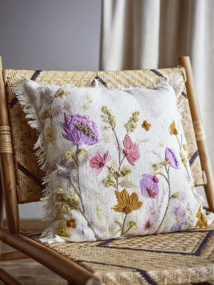 Pudens forside præsenterer et smukt vævet stof med omhyggeligt udført print og broderi af blomstermotiver i blide nuancer. Dette detaljerige håndværk skaber dybde og tekstur, der fanger øjet og inviterer til nærmere betragtning. De broderede blomster fremstår som små kunstværker, der giver puden karakter og autenticitet.