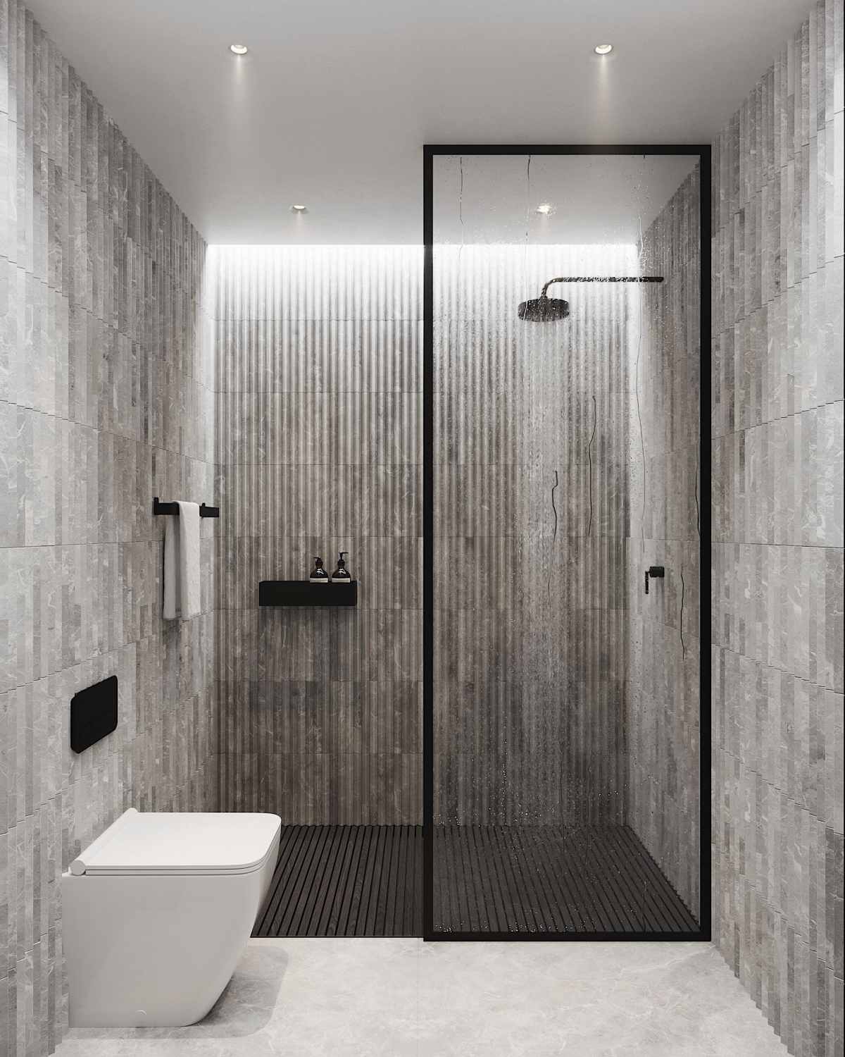 En smart detalje er de indbyggede riller i bunden, som sikrer, at vand løber væk og ikke samler sig. Dette holder hylden ren og forhindrer, at shampooflasker og andre produkter står i vand, hvilket gør vedligeholdelsen nem og hygiejnisk.