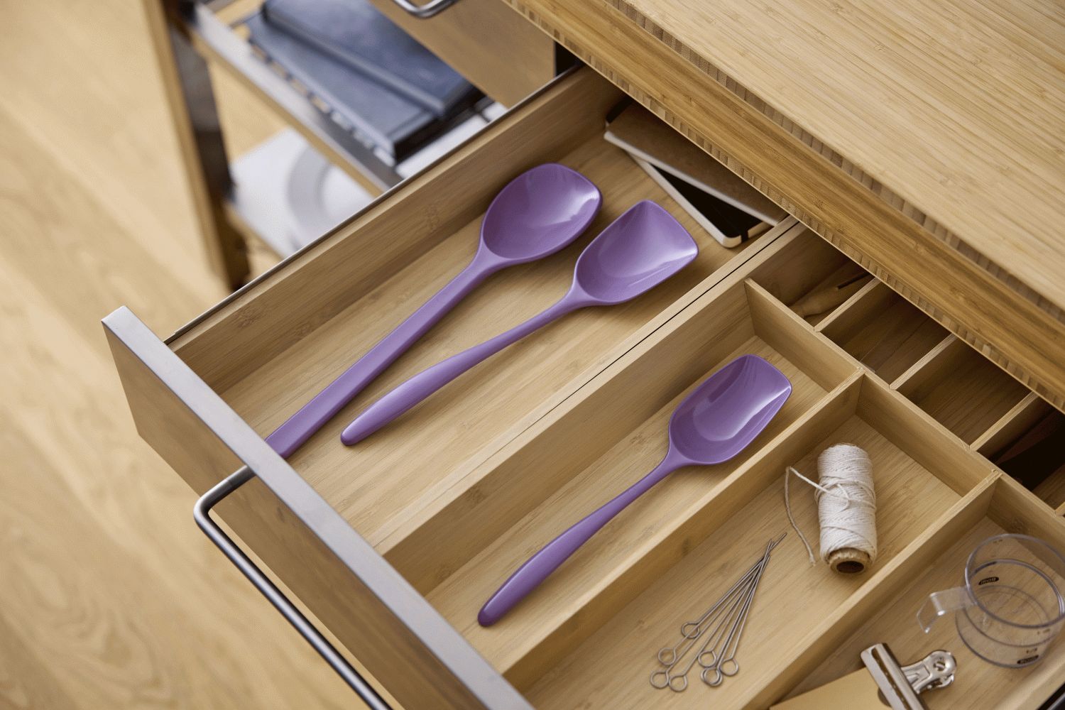 - Komplet sæt med tre forskellige grydeskeer i smuk lavendel farve