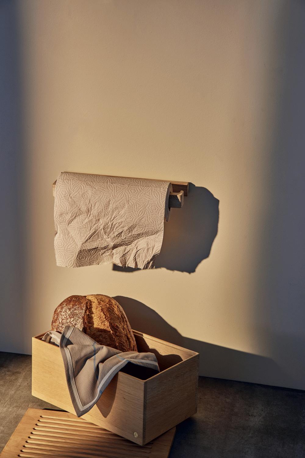 Andersen Furniture præsenterer en køkkenrulleholder, der genskaber den klassiske vægmonterede toiletrulleholders nostalgiske charme i en moderne køkkenudgave. Dette funktionelle tilbehør i massiv eg bringer både orden og personlighed til køkkenets daglige rutiner.Holderen monteres enkelt på væggen og sikrer, at køkkenrullen altid er placeret inden for bekvem rækkevidde under madlavning og bagning. Det gennemtænkte design kombinerer praktisk funktionalitet med æstetisk appel, hvilket gør den til mere end blot et praktisk redskab – den bliver et dekorativt element, der tilføjer karakter til køkkenindretningen.
