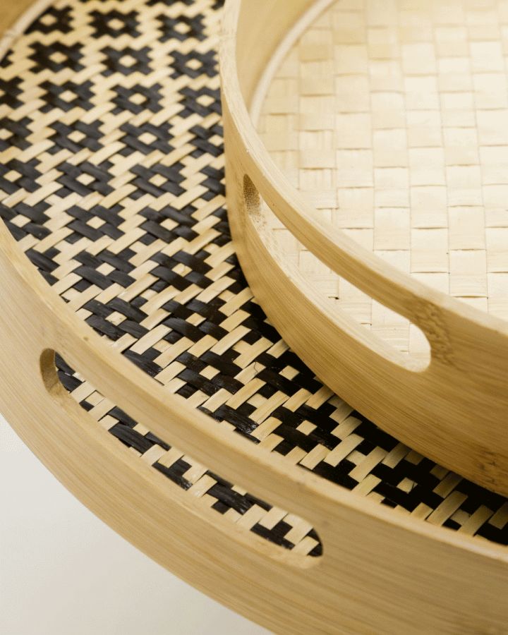 De to bakker kommer med forskellige udtryk, der gør dem alsidige i brugen. Den ene bakke har et sort, geometrisk mønster, der tilføjer en moderne kant til designet, mens den anden fremstår i et helt naturligt flet, som fremhæver materialets autentiske skønhed. Denne kontrast mellem de to designs gør det muligt at bruge dem både sammen og hver for sig, alt efter hvilken stemning du ønsker at skabe i dit hjem.