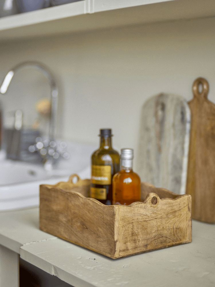 Nonnie opbevaringsæsken fra Bloomingville bringer orden og varme til køkkenet med sin tidløse og funktionelle udformning. Fremstillet i mangotræ med en lakeret overflade fremstår denne æske som en elegant løsning til opbevaring af alt fra te og kaffe til krydderier og små køkkenredskaber. De blødt afrundede overkanter og de praktiske, afrundede håndtag gør det nemt at flytte æsken rundt, mens den lyse trætone tilfører et naturligt og indbydende udtryk til indretningen.Mangotræet giver hver æske sit eget særpræg, da naturlige farvevariationer kan forekomme. Dette betyder, at ingen to æsker er ens, og du får dermed et unikt produkt, der afspejler træets autentiske karakter. Den lakerede overflade beskytter træet og gør det lettere at vedligeholde, samtidig med at den fremhæver træets naturlige struktur og nuancer.