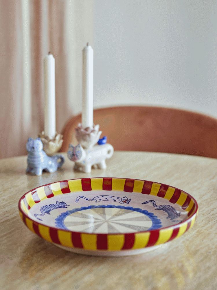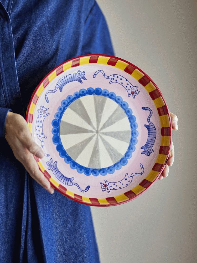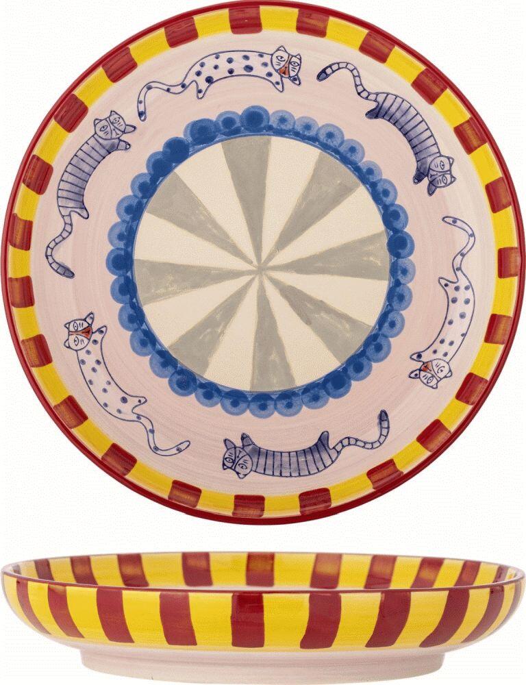 Bloomingville Missy Fad bringer et charmerende og farverigt udtryk til dit bord med sit håndmalede design og unikke detaljer. Dette smukke fad i stentøj forener funktionalitet med kunstnerisk udtryk og skaber en hyggelig atmosfære, uanset om det bruges til servering eller som et dekorativt element i hjemmet.Fadet præsenterer sig i en blød rosa tone, der danner en varm og indbydende base for det levende motiv. Kanten er prydet med striber i dyb rød og varm gul, som tilføjer en legende kontrast og giver fadet et festligt udtryk. Det centrale vindmøllemotiv i grå og beige nuancer omkranses af blå katte med udtryksfulde ansigter, der giver designet personlighed og charme. Blå prikker indramrer motivet og skaber en harmonisk helhed, der fanger blikket.
