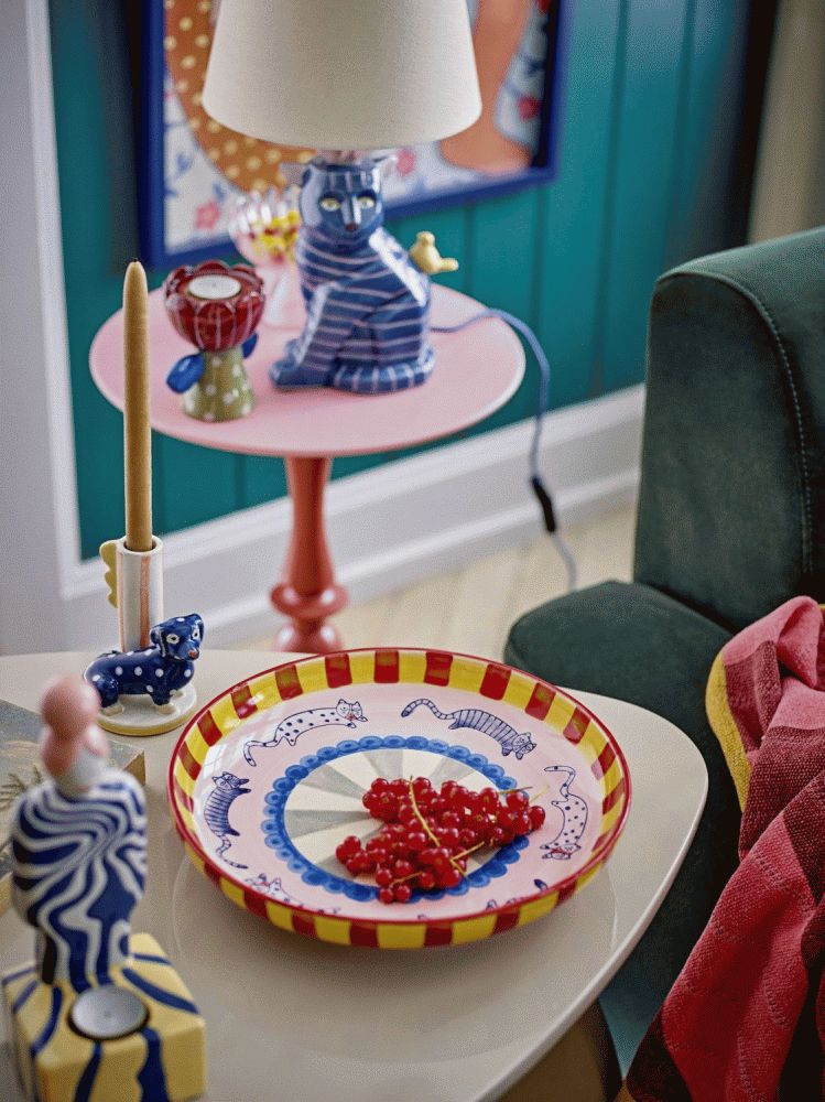 Fadet præsenterer sig i en blød rosa tone, der danner en varm og indbydende base for det levende motiv. Kanten er prydet med striber i dyb rød og varm gul, som tilføjer en legende kontrast og giver fadet et festligt udtryk. Det centrale vindmøllemotiv i grå og beige nuancer omkranses af blå katte med udtryksfulde ansigter, der giver designet personlighed og charme. Blå prikker indramrer motivet og skaber en harmonisk helhed, der fanger blikket.