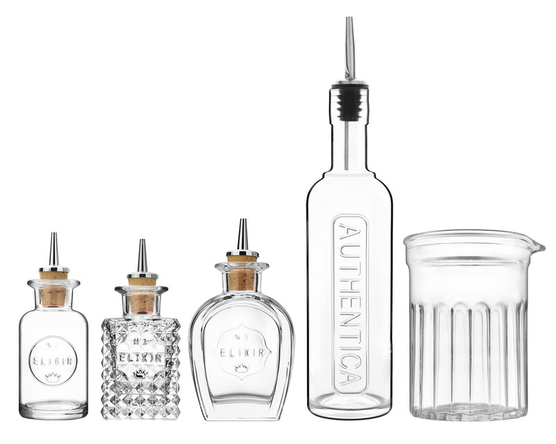 Bland dine cocktails med Luigi Bormiolis stilfulde Elixir stænkflasker, der er perfekt til at mixe drinks, men også til at tilsætte aroma til saucer og desserter. Flaskerne har skænkeprop til at hælde den helt rigtige mængde og et smukt facetteret glas med tekst.