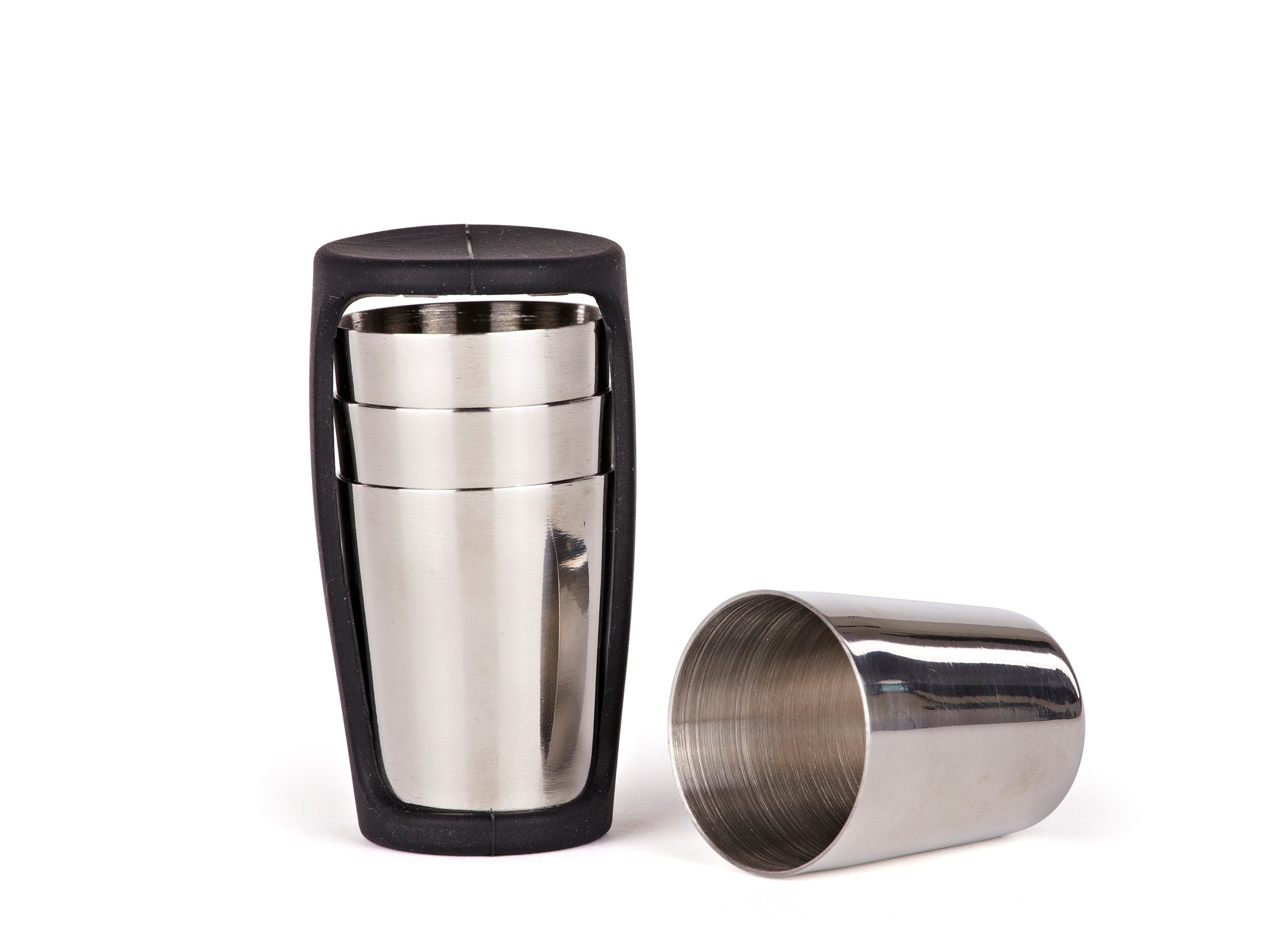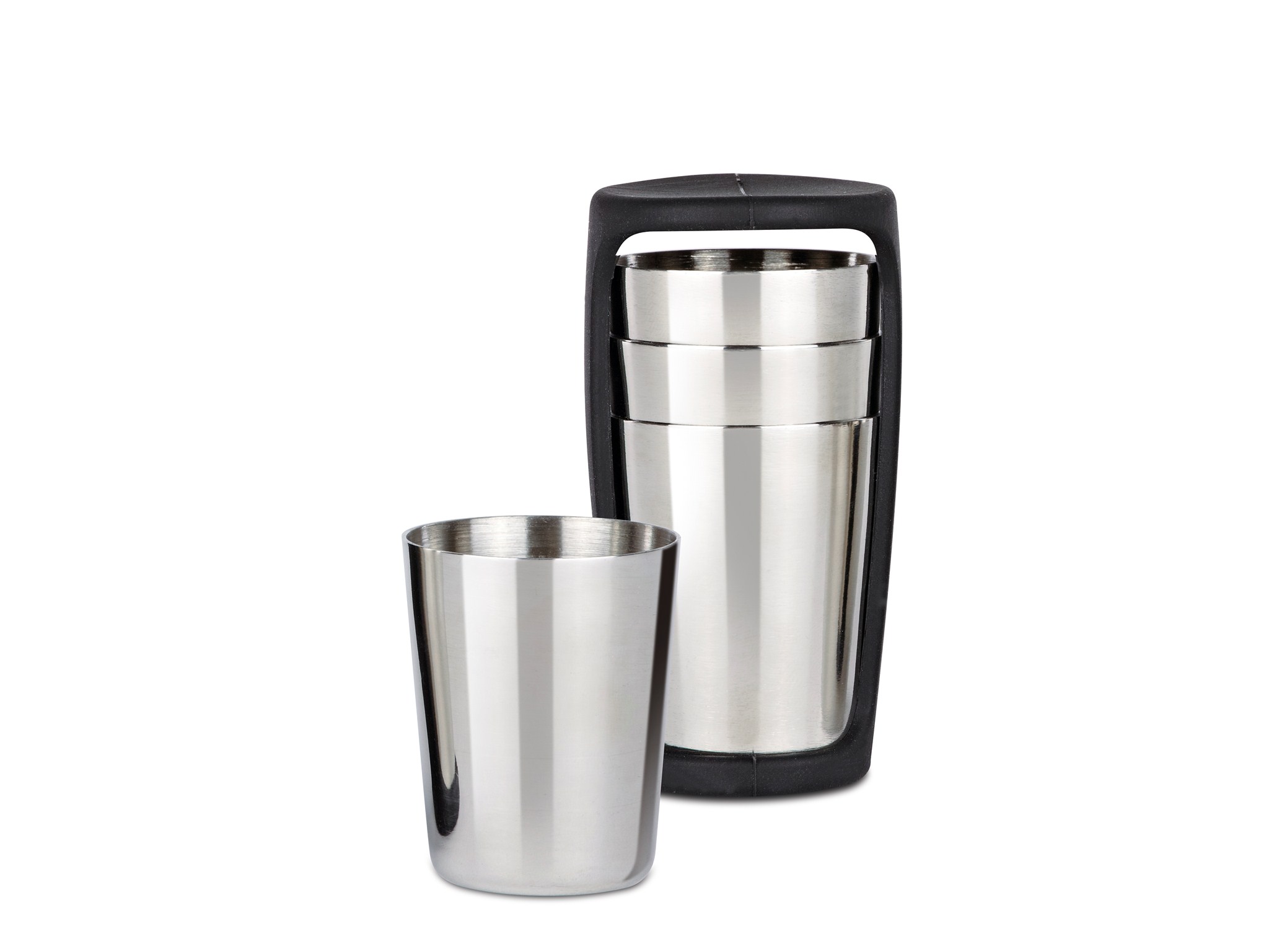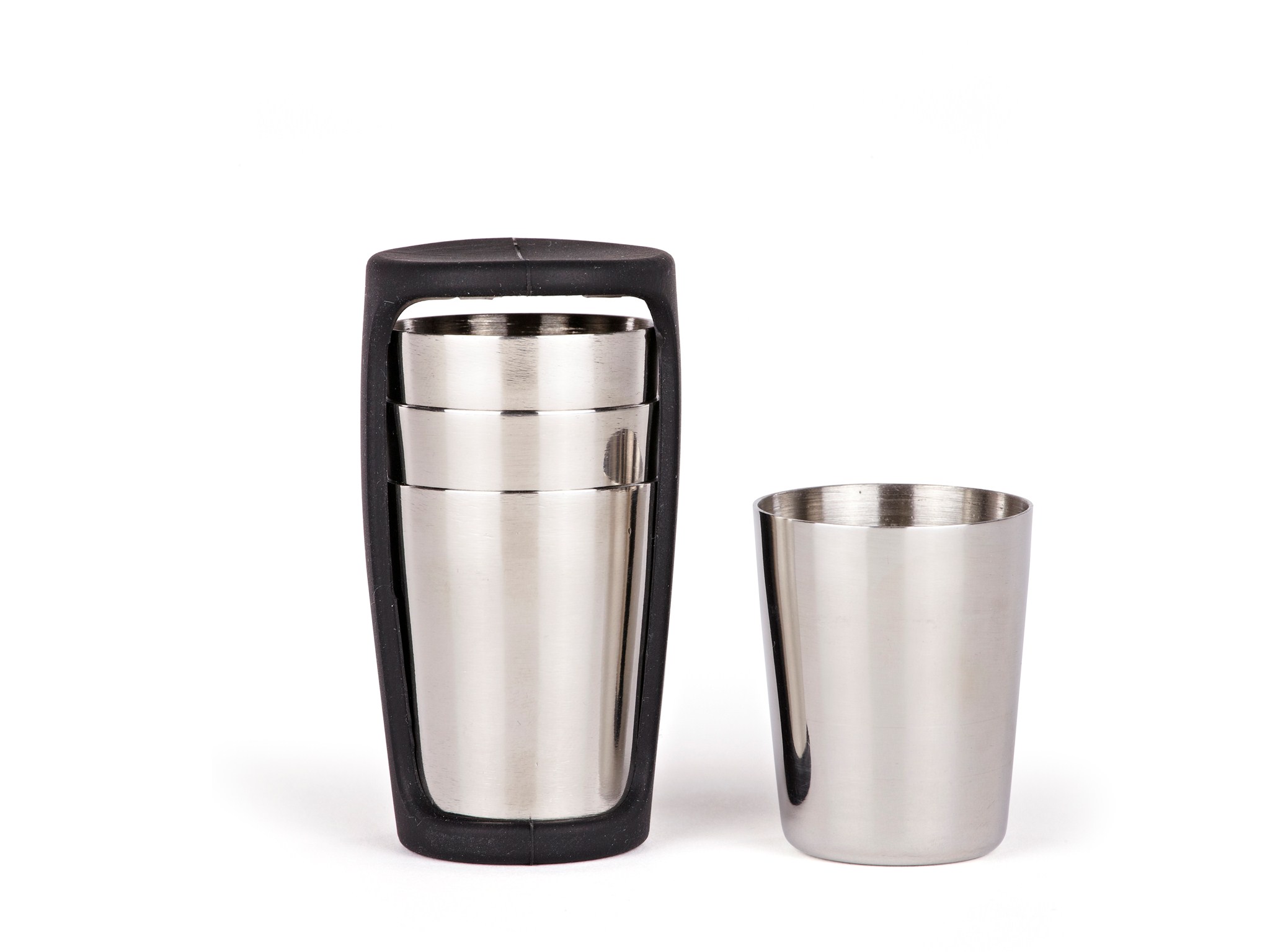 Krus til Nuance Lommelærke i praktisk silikoneholder, der holder krusene samlet, når de transporteres. Krusene er ligesom den tilhørende lommelærke fremstillet i rustfrit stål.