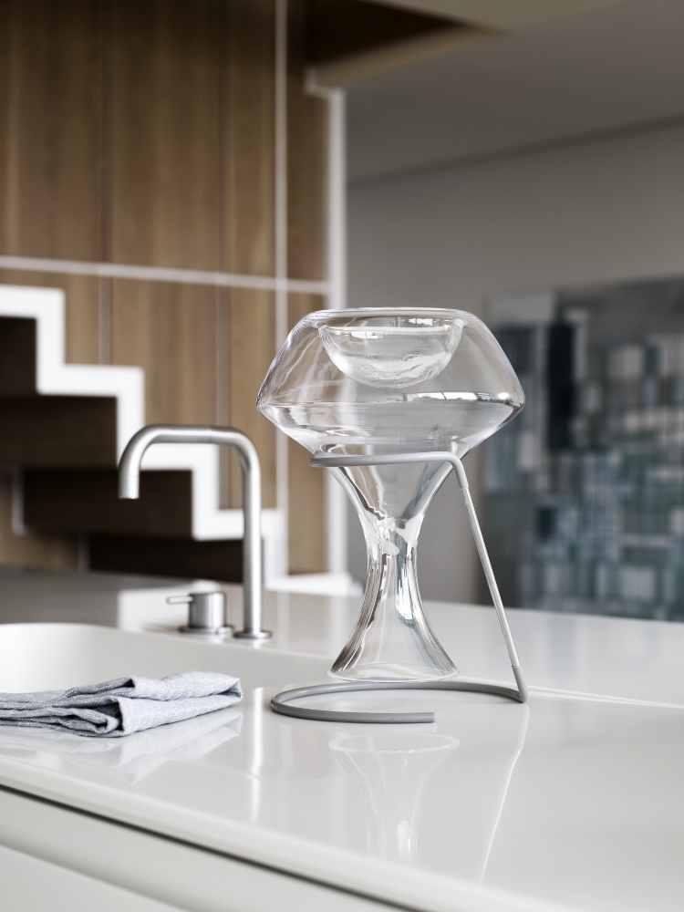 En holder til din karaffel betyder, at du både undgår kalkrander og støv i din Perfectionkaraffel. Karaffelholderen er specielt udviklet til Perfectionkaraflen. Når du har brugt karaflen, skyller du den med varmt vand og sætter den i holderen med bunden opad. På den måde står den altid funklende klar til næste servering. Holderen er beklædt med silikone, der skåner både karaffel og hylde.
