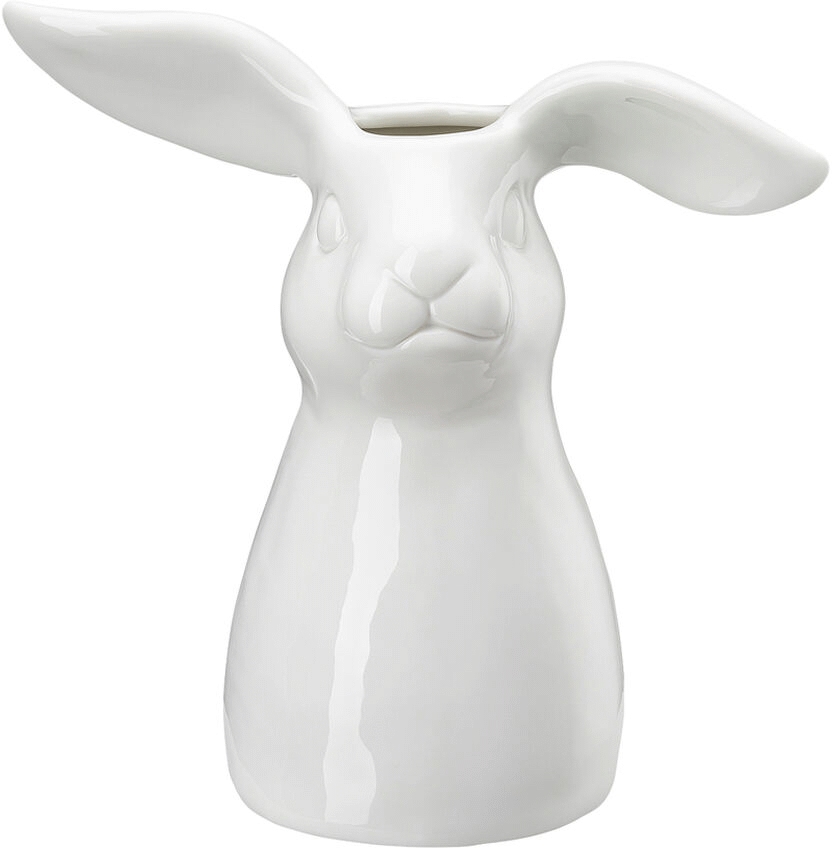 Vasen er fremstillet i fineste porcelæn og præsenterer en elegant hare, der sidder oprejst med ørerne strittende opad. Den hvide glasur giver vasen en ren og tidløs æstetik, der passer perfekt ind i både moderne og klassiske indretningsstile. Med en højde på 18,9 cm fungerer den både som en funktionel vase til forårsblomster og som et selvstændigt dekorationselement, der tilføjer personlighed og charme til ethvert rum.