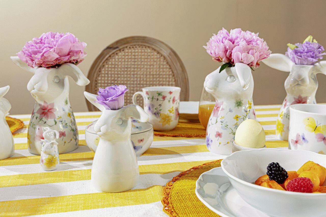 Vasen er ikke kun funktionel, men også et smukt kunstværk, der kan stå alene som en skulpturel dekoration på vindueskarmen, hylderne eller spisebordet. Den kompakte størrelse gør den ideel til mindre rum, hvor den tilføjer et strejf af forårsglæde uden at fylde for meget. Haremotivet giver et legende og indbydende udtryk, der appellerer til både børn og voksne.