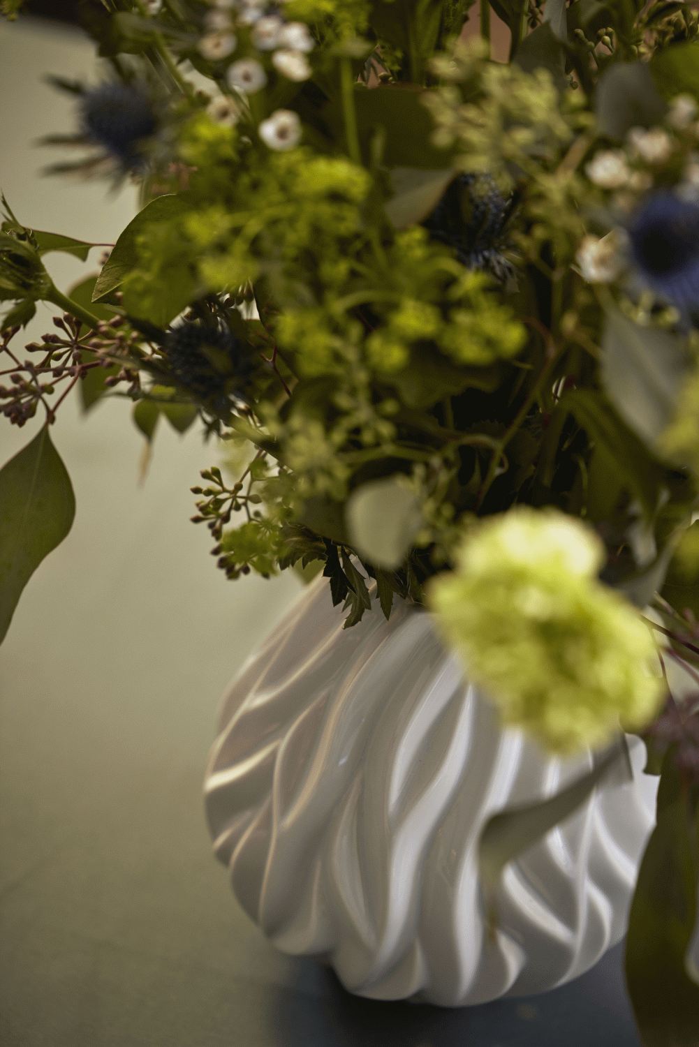 Vasens skulpturelle karakter gør den til mere end blot en beholder for blomster – den er et selvstændigt kunstobjekt, der tilfører karakter og æstetisk værdi til ethvert rum. Den hvide glasur skifter nuance afhængigt af lysindfald, fra varme til køligere toner, hvilket skaber en levende fornemmelse, der minder om ildens konstante foranderlighed.