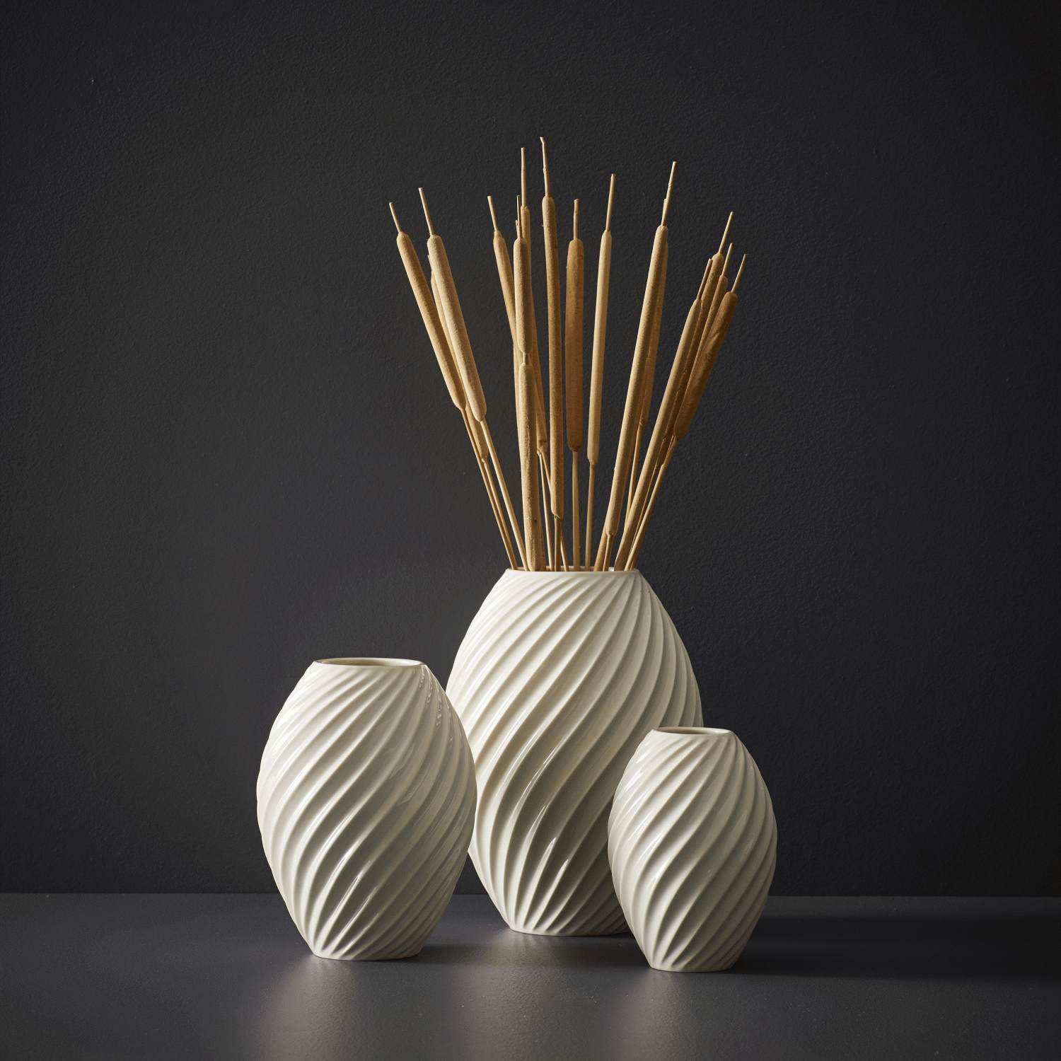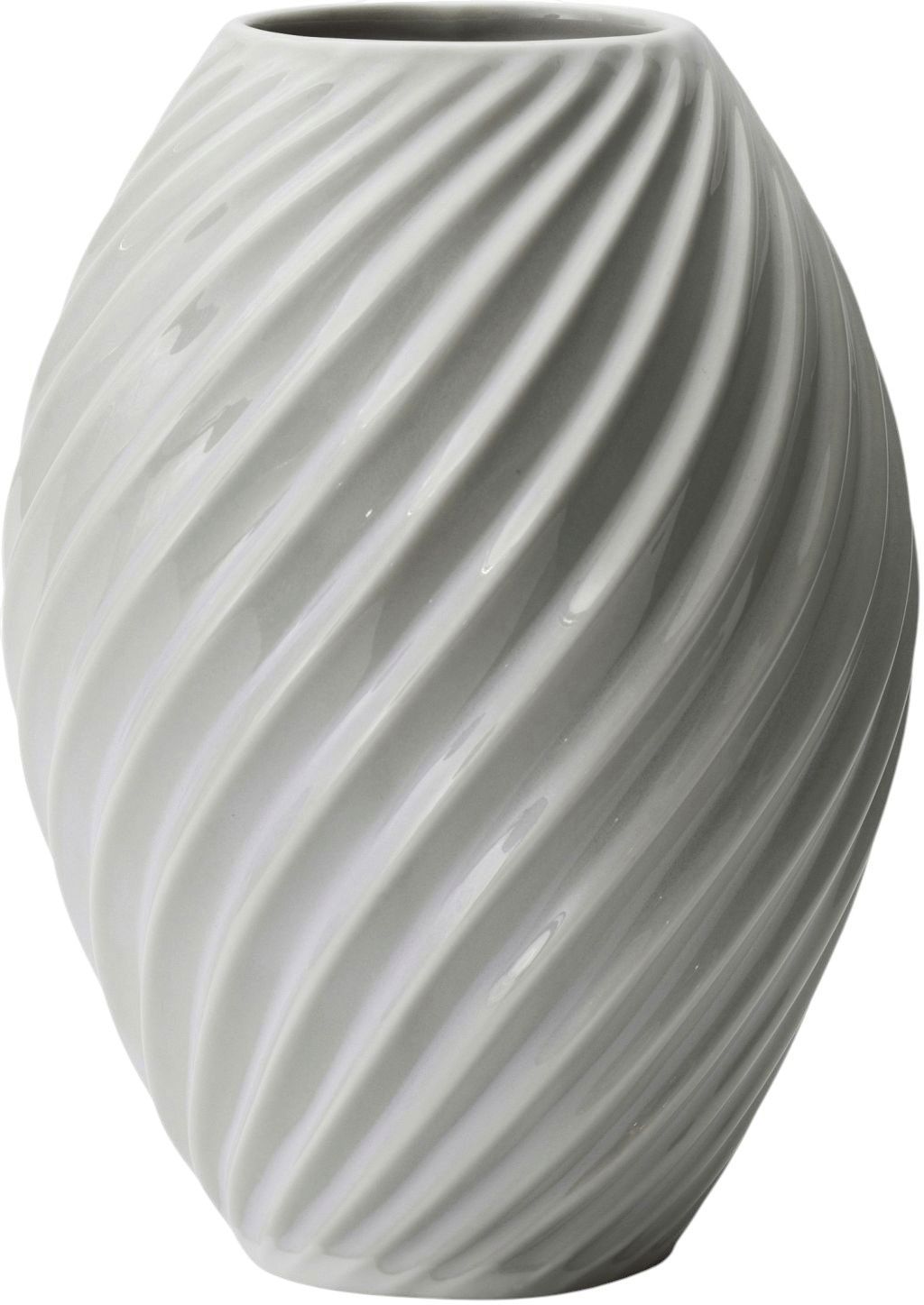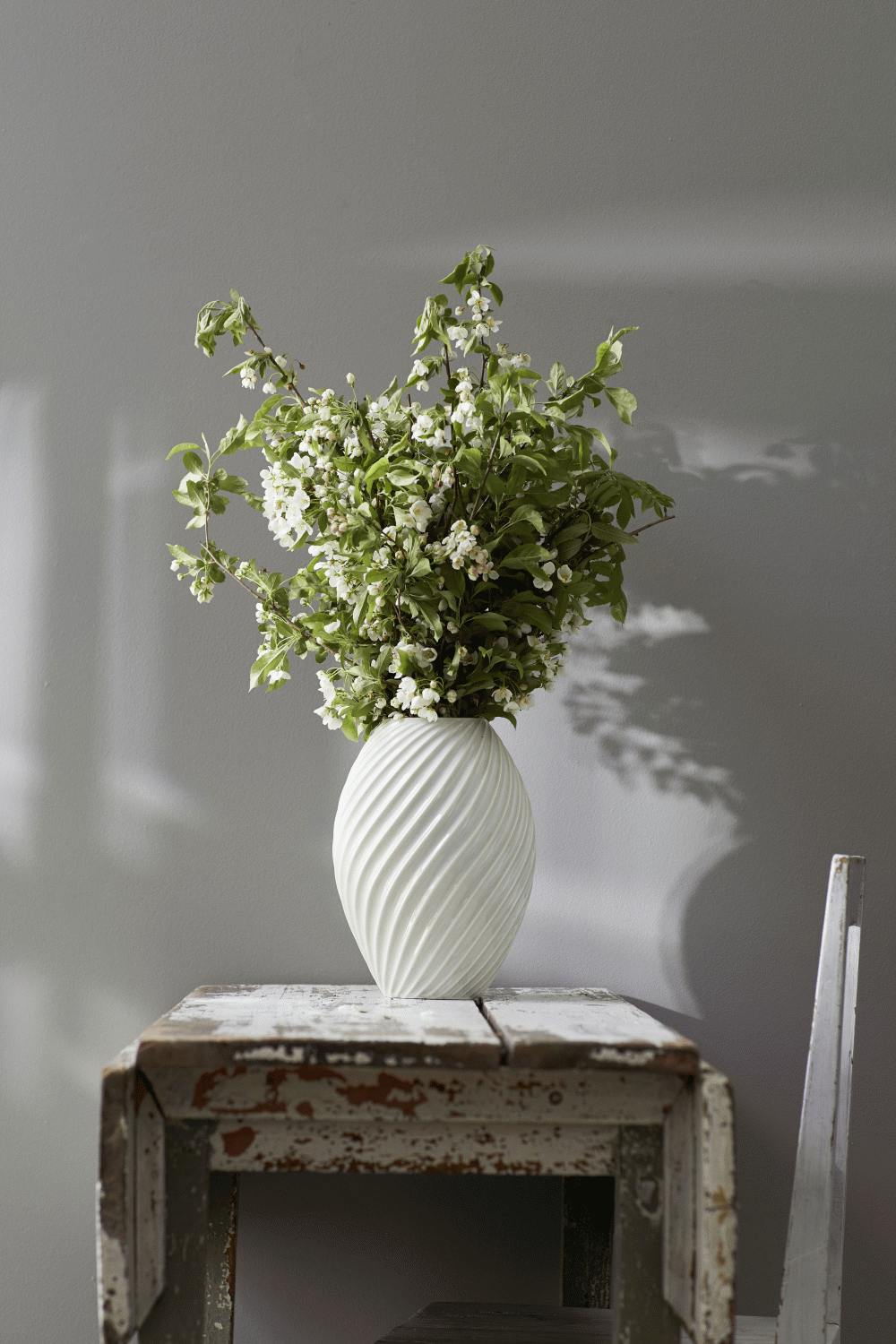 Den hvide glasur fremhæver på smukkeste vis vasens organiske form og understreger de fine detaljer i det spiralformede mønster. Glasuren giver desuden vasen en glat, silkeblød overflade, der reflekterer lyset på en subtil måde og tilfører ethvert rum en rolig elegance.