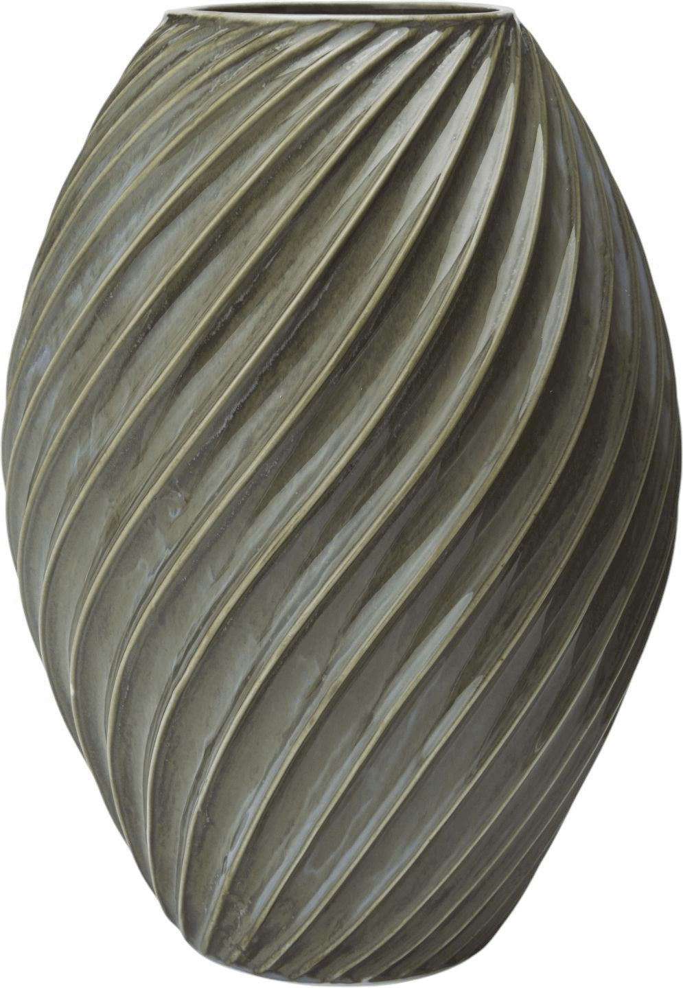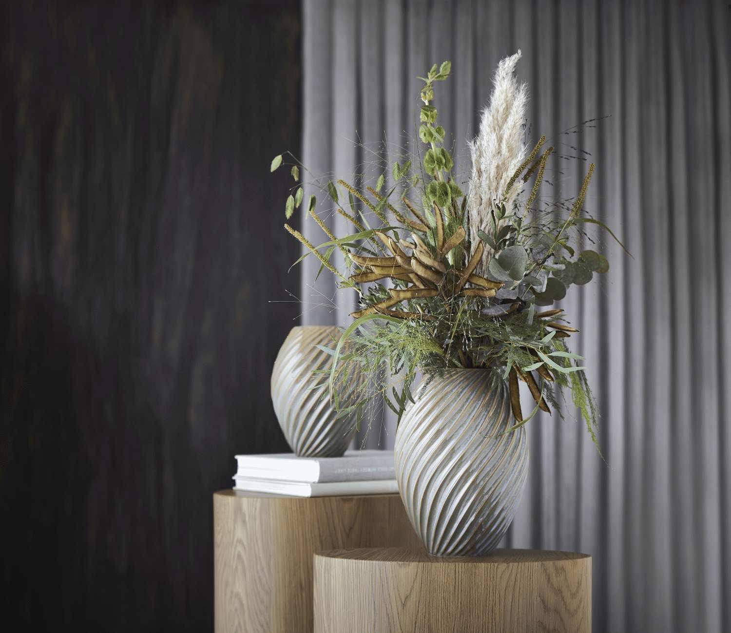River vase fra Morsø er et stykke elegant skandinavisk design, der tilfører ethvert rum en sofistikeret karakter. Det diagonale spiralmønster, der omslutter vasens slanke form, minder om lette krusninger på vandoverfladen og skaber et stramt, grafisk udtryk med visuel dybde. Den gråblå glasur fremhæver perfekt vasens konturer og giver den et roligt, nordisk udtryk.Med sine 26 cm i højde er River vasen ideel til både lange roser, afskårne blomster fra haven eller dekorative forårsgrene. Den slanke silhuet gør vasen velegnet til både minimalistiske og mere frodige blomsterarrangementer, hvor den fungerer som en stilfuld ramme, der fremhæver blomsternes naturlige skønhed.