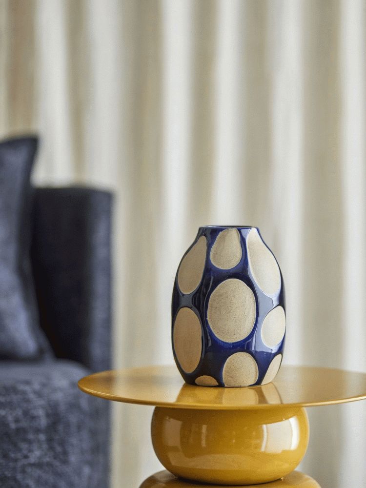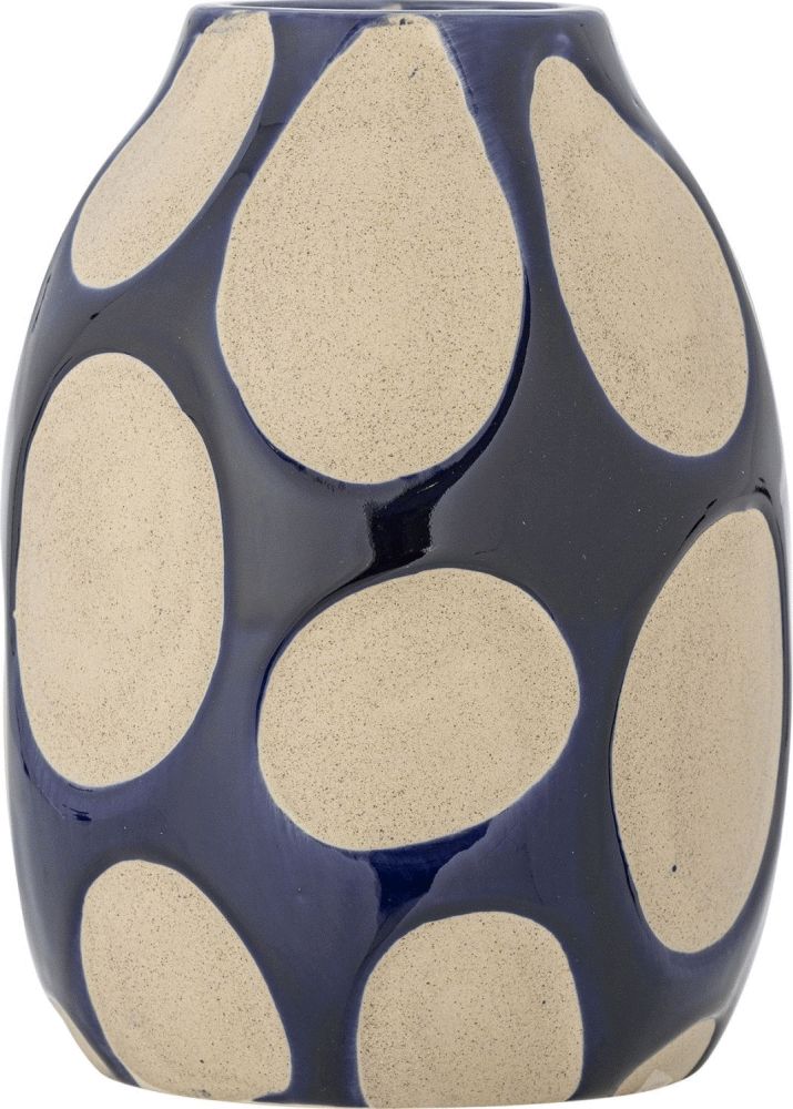 Bashir Vasen fra Bloomingville præsenterer sig med en markant grafisk profil, der tilfører personlighed og visuelt fokus til ethvert rum. Med sin afrundede silhuet og håndværksmæssige finish er denne vase et eksempel på, hvordan funktionelt design kan forenes med æstetisk udtryk. Den blanke, voksbehandlede blå glasur skaber en dyb og levende overflade, der fanger lyset på en elegant måde, mens de store beige ovale motiver giver vasen et grafisk præg, der skiller sig ud.Vasen er fremstillet i stentøj, et materiale kendt for sin robusthed og holdbarhed. Stentøj giver produktet en solid vægt og en behagelig haptisk oplevelse, samtidig med at det sikrer, at vasen kan anvendes både som dekorativt element og som praktisk beholder til friske eller tørrede blomster. Den afrundede form gør den nem at placere på hylder, borde eller vindueskarme, hvor den fungerer som et stilfuldt statement.