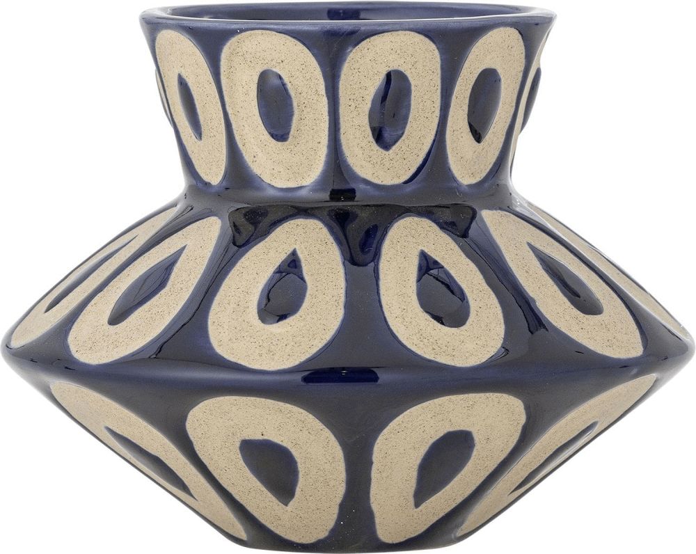 Bashir Vasen fra Bloomingville er en karakterfuld vase i stentøj, der udmærker sig ved sin skulpturelle og markante form. Med en bred midte og smallere åbning samt bund skaber vasen et dynamisk udtryk, der fanger blikket og tilføjer personlighed til ethvert rum. Den blanke, voksbehandlede blå glasur giver vasen en dyb og levende overflade, mens de beige ovale motiver skaber en elegant kontrast og et kunstnerisk præg.Denne vase er ideel til dem, der sætter pris på design med karakter og håndværksmæssig kvalitet. Den skulpturelle silhuet gør den lige så smuk som et selvstændigt dekorationselement, som den er med friske blomster eller grene. Vasen passer perfekt ind i moderne indretninger, hvor den kan stå på en hylde, et sidebord eller som et centralt element på spisebordet.