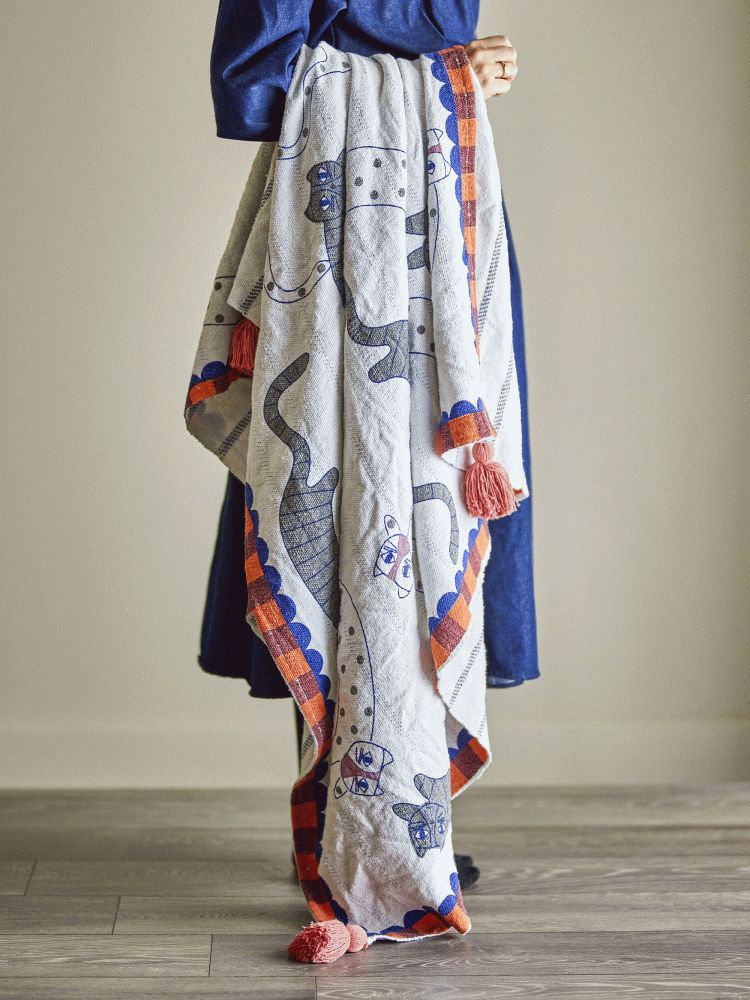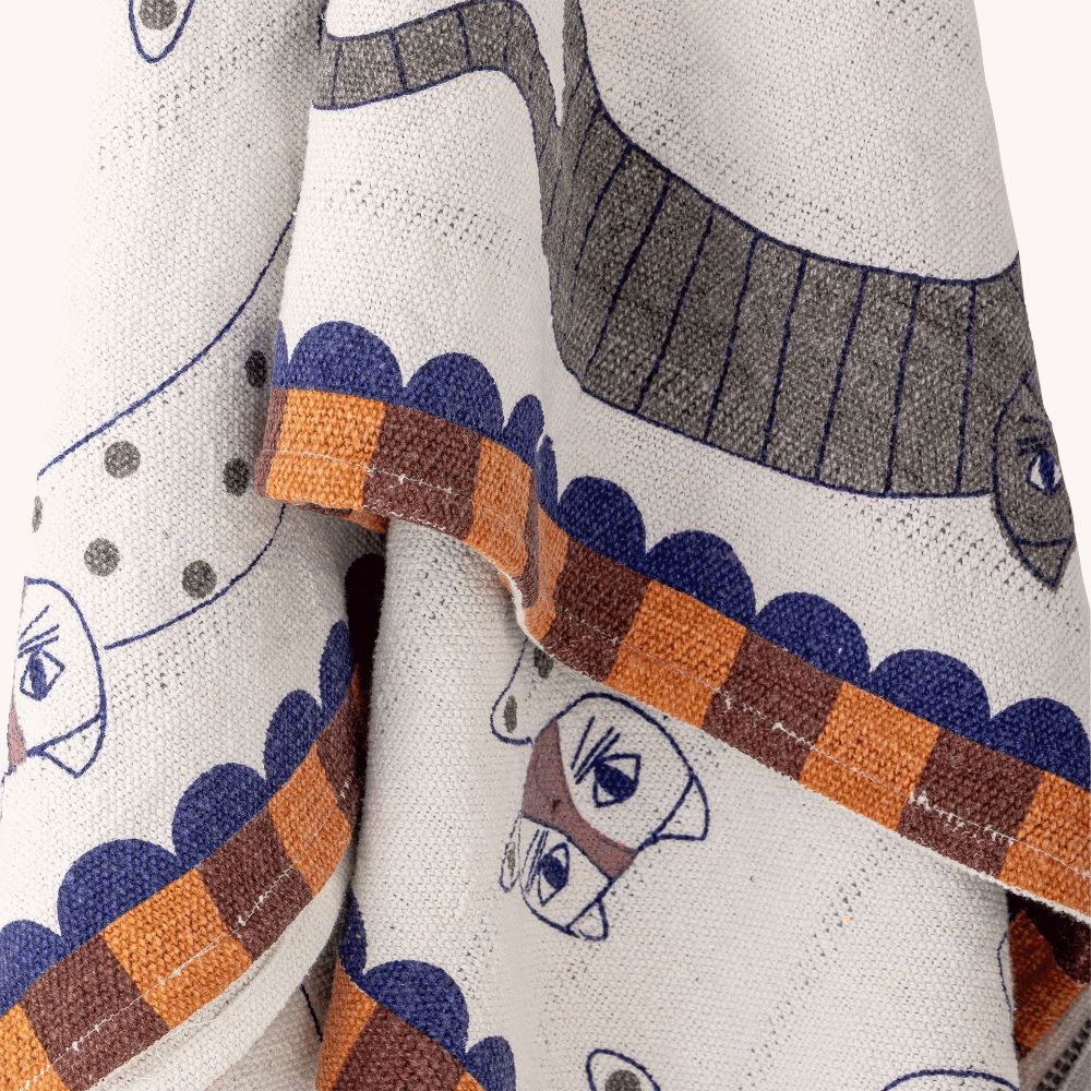 Plaiden er fremstillet i bomuld og præsenterer et sjovt printet kattemotiv på den ene side, mens den anden side byder på klassiske vævede striber. Designet er gennemtænkt med kontraster og detaljer, der gør plaiden til et spændende indslag i indretningen. Den dybe orange kant skaber en varm ramme om designet, mens de blå buer og brune tern tilføjer et legende udtryk. I hvert hjørne sidder dekorative kvaster, der giver plaiden et afsluttet og håndværksmæssigt præg.