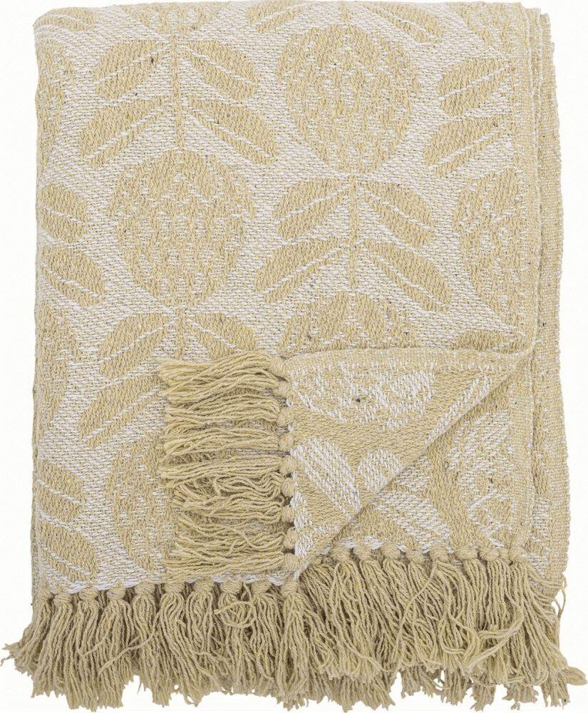 Pratello Plaiden fra Bloomingville bringer varme og personlighed ind i ethvert rum med sit karakteristiske bladmotiv i gul nuance mod en blød cremefarvet baggrund. Dette plaid er vævet i bomuld og præsenterer et symmetrisk mønster, der skaber en harmonisk balance mellem moderne design og tidløs elegance. Bladmotivet gentages på begge sider af plaiden, hvilket giver fleksibilitet i brugen og sikrer, at det dekorative udtryk bevares uanset hvordan det draperes.Overfladen har en let tekstureret struktur, der tilføjer dybde og taktil interesse til designet. De lange frynser i begge ender er tæt samlet og bidrager til plaidens afslappede og indbydende karakter. Dette gør Pratello Plaiden til et ideelt valg både som funktionel tekstil og som et dekorativt element i hjemmet.