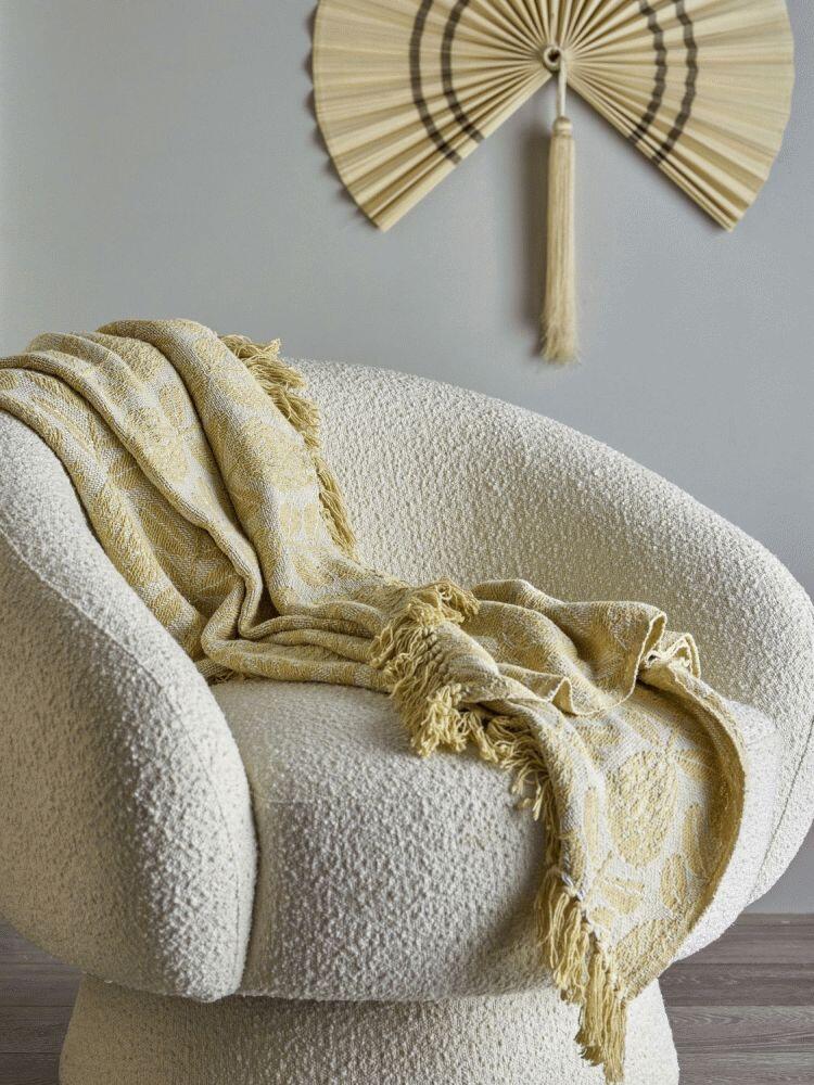 Med sine dimensioner på 155 cm i længden og 130 cm i bredden er plaiden perfekt til at lægge over sofaen, stolen eller sengen. Den varme gule farve skaber en indbydende atmosfære og fungerer som et visuelt fokuspunkt, der kan løfte hele rummets udtryk. Samtidig er den cremefarvet bund diskret nok til at passe ind i forskellige indretningsstile, fra skandinavisk minimalisme til mere eklektiske og farverige hjem.