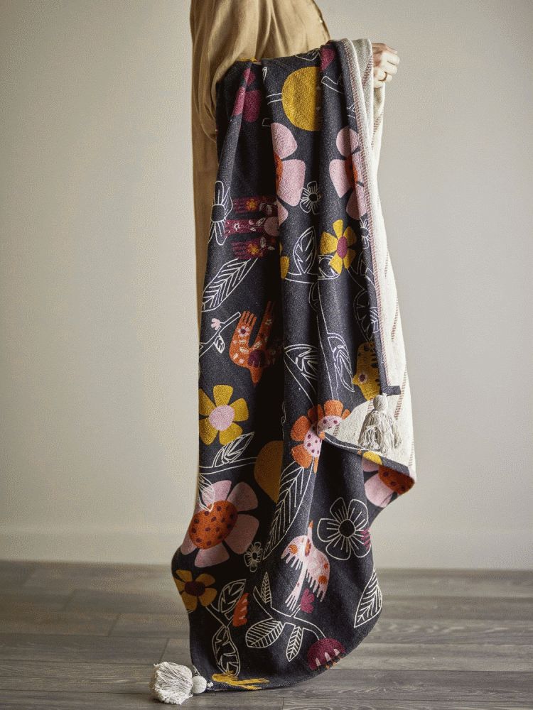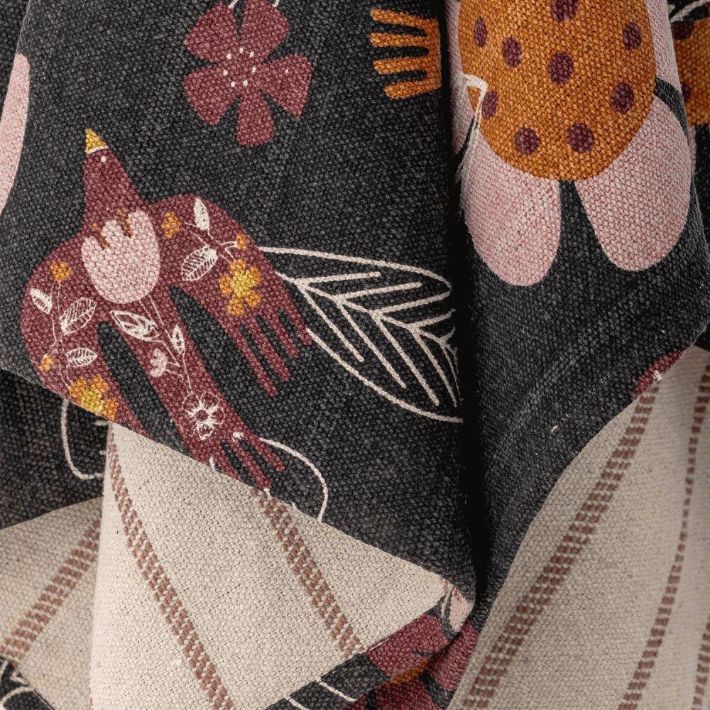 Plaidet er fremstillet i en blød bomuldsblanding, der føles behagelig mod huden og samtidig bevarer sin struktur over tid. Den fint vævede tekstur giver produktet en kvalitetsfølelse, mens den gennemtænkte konstruktion sikrer holdbarhed til daglig brug. Designet udmærker sig ved sin dobbeltsidethed – forsiden præsenterer et udtryksstærkt blomsterprint i rige, varme nuancer, der tilfører liv og karakter til indretningen. Bagsiden er holdt i et mere diskret udtryk med vævede striber i rød og beige, hvilket giver dig mulighed for at variere stemningen efter behov.