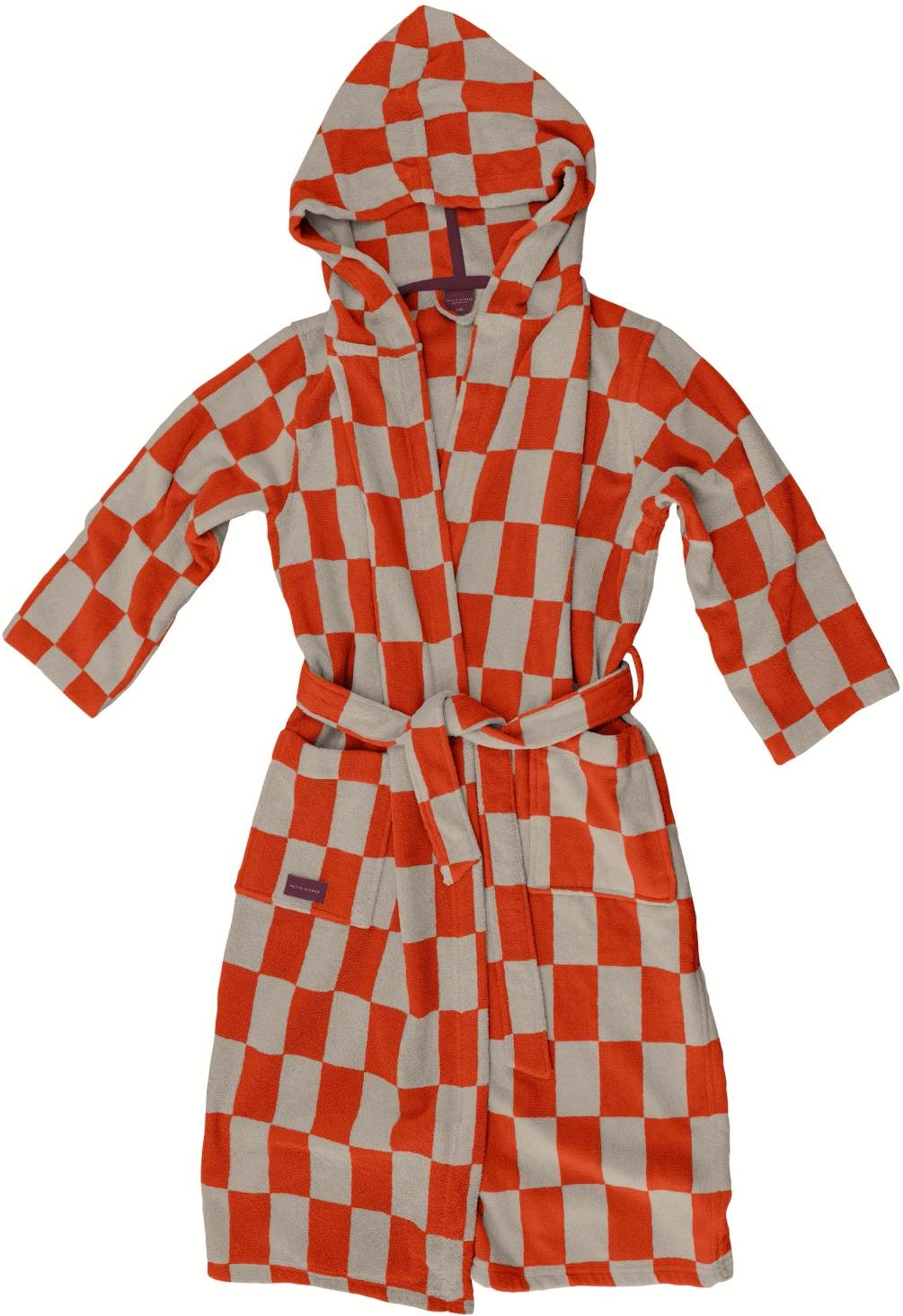 RETRO-kåben præsenterer seriens karakteristiske tofarvede mønster i orange og sand, vævet i blød bomuldsfrotté, der føles fyldig og behagelig mod huden. Et vinrødt kontrastbånd på indersiden og en logolabel på lommen tilføjer raffinerede detaljer og understreger det gennemarbejdede udtryk. Kåben har et unisex, afslappet snit med bindbart taljebælte og sidelommer til små nødvendigheder. Let, absorberende og designet til daglig brug – ideel efter badet eller til rolige stunder med afslapning, en svømmetur eller til langsomme morgener derhjemme. Findes i to størrelser. OEKO-TEX® standard 100-certificeret.Vaskes ved 60° C, tørretumbles ved maksimal varme, undgå skyllemiddel.Længde: 126 cm