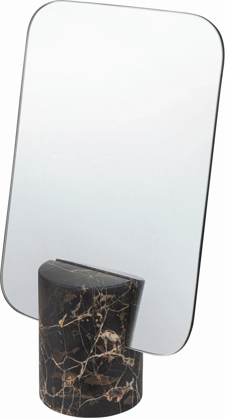 MARBLE spejlet i brun forener funktionalitet med naturstenens varme toner. Hver marmorfod har sit eget farvespil og sine karakteristiske åretegninger, så intet spejl er helt ens. Den tunge, cylindriske fod holder spejlet sikkert på plads, mens de afrundede hjørner giver et blødt og afbalanceret udtryk. Spejlet tilfører en følelse af rolig luksus på badeværelset, men passer også smukt på et sminkebord eller i entréen. Et design skabt af naturen – forfinet til hverdagsbrug. Diameter på fod: 8 cm