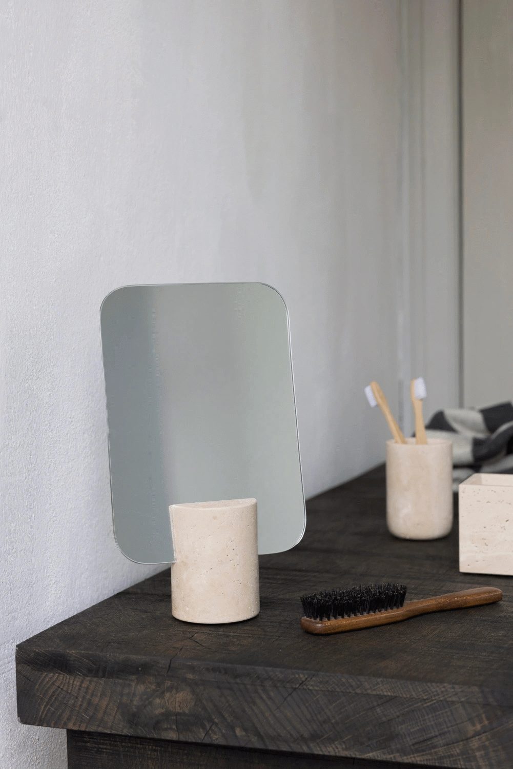 TRAVERTINE spejlet i linen tilfører varme og lethed med sin lyse beige nuance og naturlige overfladestruktur. Hver travertinfod har små variationer og porer, som gør hvert spejl til et unikum. Den runde spejlform står i smuk kontrast til stenens rå tekstur, mens den cylindriske fod giver et stabilt og elegant udtryk. Spejlet passer perfekt på badeværelset, men fungerer lige så fint i et soveværelse eller på et sminkebord. Et tidløst design, hvor naturens materialer får lov at træde frem i al deres enkelhed. Diameter på fod: 8 cm