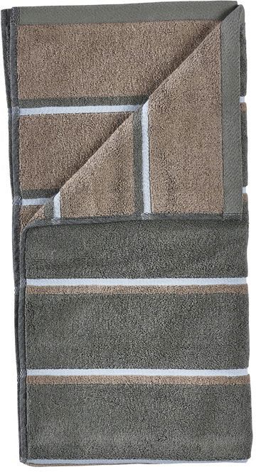 Håndklædet er udført i en smuk kombination af olive green, taupe og blue fog, som giver et sofistikeret og harmonisk farvespil. En gennemtænkt detalje ved dette håndklæde er, at hver side fremhæver sin egen dominerende farve. Denne dobbeltsidet funktion giver dig mulighed for at vælge mellem to forskellige udtryk alt efter stemning og indretning, hvilket gør håndklædet ekstra alsidigt i brugen.