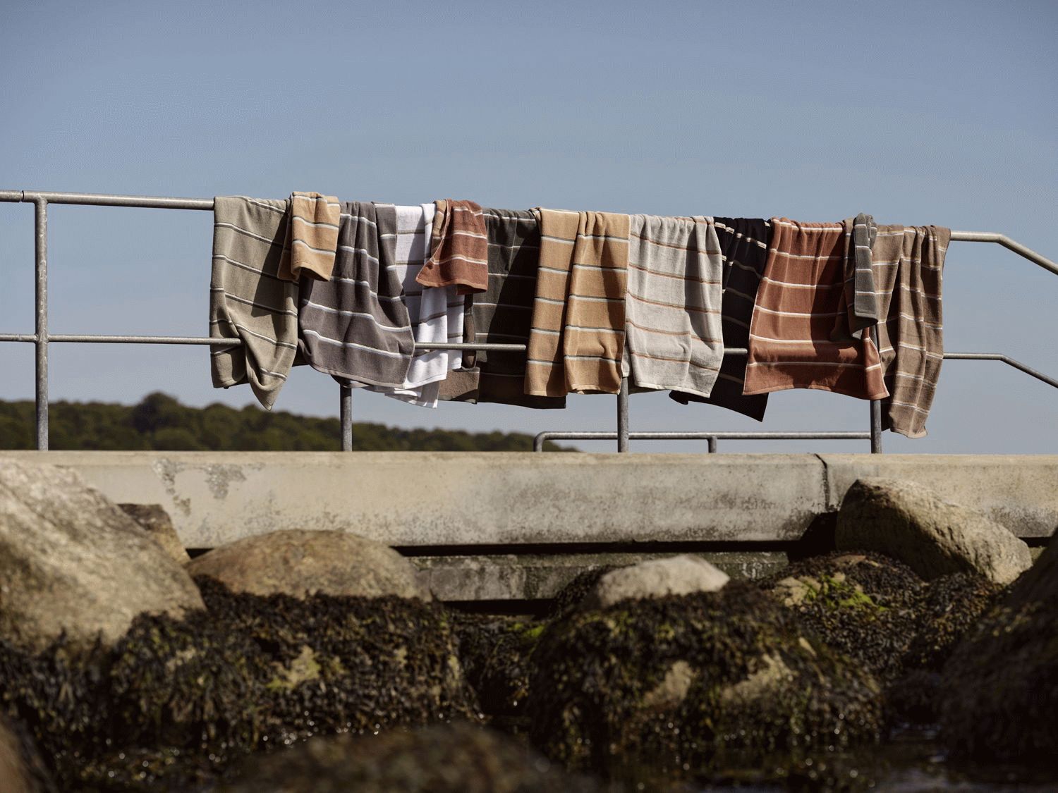 Det gennemtænkte design leger elegant med perspektiv og farvebalance, hvor de stramme linjer skaber en visuel dybde, der fanger blikket. Hver side af håndklædet fremhæver sin egen dominerende farve – en intelligent detalje, der giver dig to forskellige udtryk i ét og samme produkt. De retroinspirerede striber tilfører et grafisk, urbant touch, som gør håndklædet til mere end blot et funktionelt tekstil – det bliver en del af badeværelsets indretning.