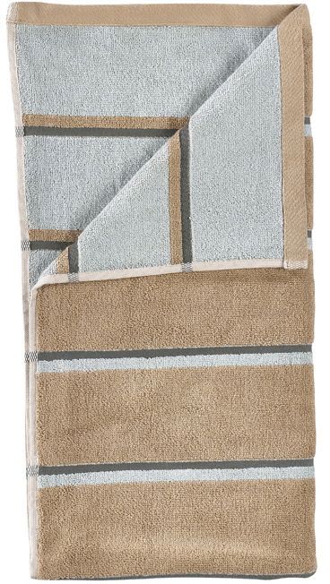 Zone Denmark præsenterer Sauna håndklædet i en farverig kombination af camel, ice blue og olive green – et håndklæde der forener klassisk skandinavisk design med moderne grafik. De markante striber skaber et visuelt udtryk, der minder om de stramme linjer i en træbeklædt sauna, hvor perspektiv og farvebalance går hånd i hånd.Håndklædet er designet med en gennemtænkt detalje: Hver side fremhæver sin egen dominerende farve, hvilket giver dig mulighed for at skifte udtryk alt efter humør og indretning. Den ene side lægger vægt på én farvetone, mens den anden side fremhæver en anden – to forskellige looks i samme håndklæde. De retroinspirerede striber tilføjer et grafisk og urbant præg, der passer perfekt ind i det moderne badeværelse.