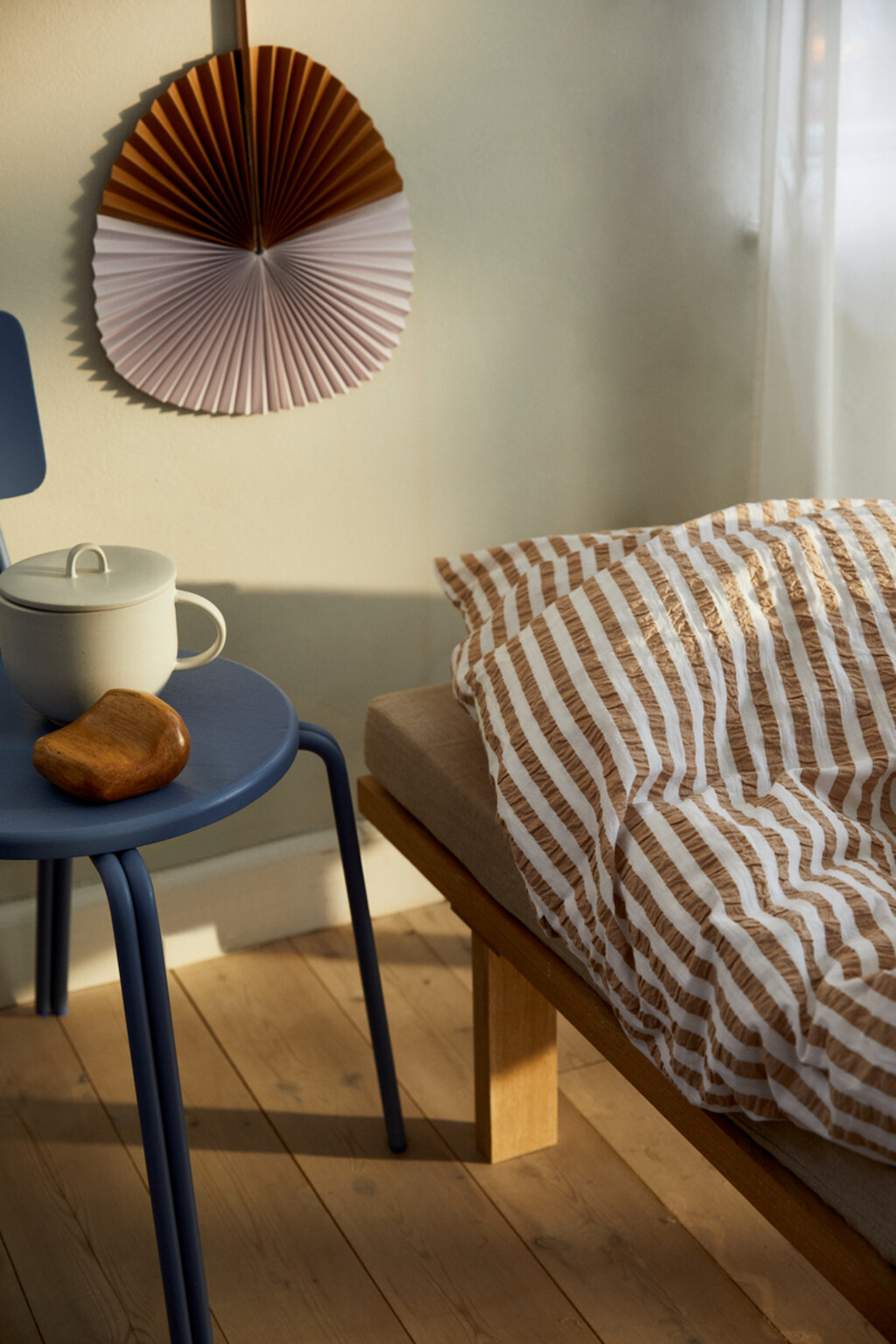 Det sæt tøj du bruger allermest tid i, er dit sengetøj. Derfor er sengetøj fra Juna skabt med intentionen om at være sanseligt, behageligt og 100% økologisk og bæredygtigt, så du trygt kan lægge dig til ro hver aften og få en god nats søvns. Juna handler om glæden ved at omgive sig med tekstiler, der gør livet smukkere, blødere, mere farverigt og sjovere. Derfor er farver og mønstre en stor del af Juna og giver sengetøjet en hyggelig og uhøjtidelig følelse. Den velkendte og klassiske stribede vævning fortolkes i en moderne farvepalet og det er netop kombinationen af det nostalgiske og nyskabende er med til at skabe en unik og glad stemning i indretningen. De stribede Bæk & Bølge i sand/hvid har en skøn sommerfarve der leder tankerne hen på stribede vintage liggestole og parasoller. Materialet er 100% økologisk bomuld, der både er OEKO-TEX®-mærket og GOTS-certificeret. Pudebetrækket lukkes med kuvertlukning, mens dynebetrækket lukkes med knaplukning. Har du flere forskellige sengesæt fra Juna, kan du mixe og matche de forskellige farver og mønstre på kryds og tværs og skabe din helt egen stil i soveværelset. Bæk & Bølge er vævet, så det har en helt speciel tekstur, der lader luften cirkulere mellem huden og dynen – perfekt til de varme sommernætter. Det giver en god nats søvn, så du kan restituere og lade op til en ny dag. Og så er det ovenikøbet strygefrit, så du kan lade den lune sommervind om tørringen og lægge sengetøjet på direkte fra tørresnoren.