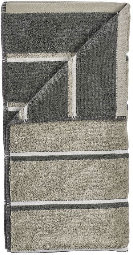 Håndklædet er udført i en kombination af Eucalypt, Olive Green og Soft Grey – en nuanceret farvepalet, der tilføjer et moderne og afdæmpet udtryk til badeværelset. Det særlige ved designet er, at hver side fremhæver sin egen dominerende farve, hvilket giver dig mulighed for at skifte mellem to forskellige udtryk alt efter dit humør eller indretning. De retroinspirerede striber skaber et grafisk og urbant look, der passer perfekt ind i både klassiske og moderne badeværelser.