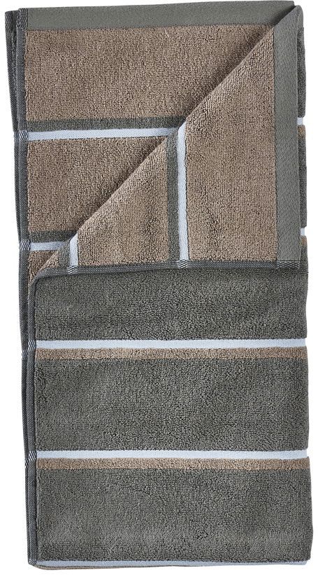 Dette badehåndklæde i størrelsen 70x140 cm udmærker sig ved sin dobbelte identitet. Hver side præsenterer sin egen dominerende farve i kombinationen Olive Green, Taupe og Blue Fog, hvilket giver dig mulighed for at vende håndklædet efter humør eller indretning. De retroinspirerede striber skaber et urbant, grafisk præg, der tilføjer personlighed og karakter til enhver badeværelsesindretning.