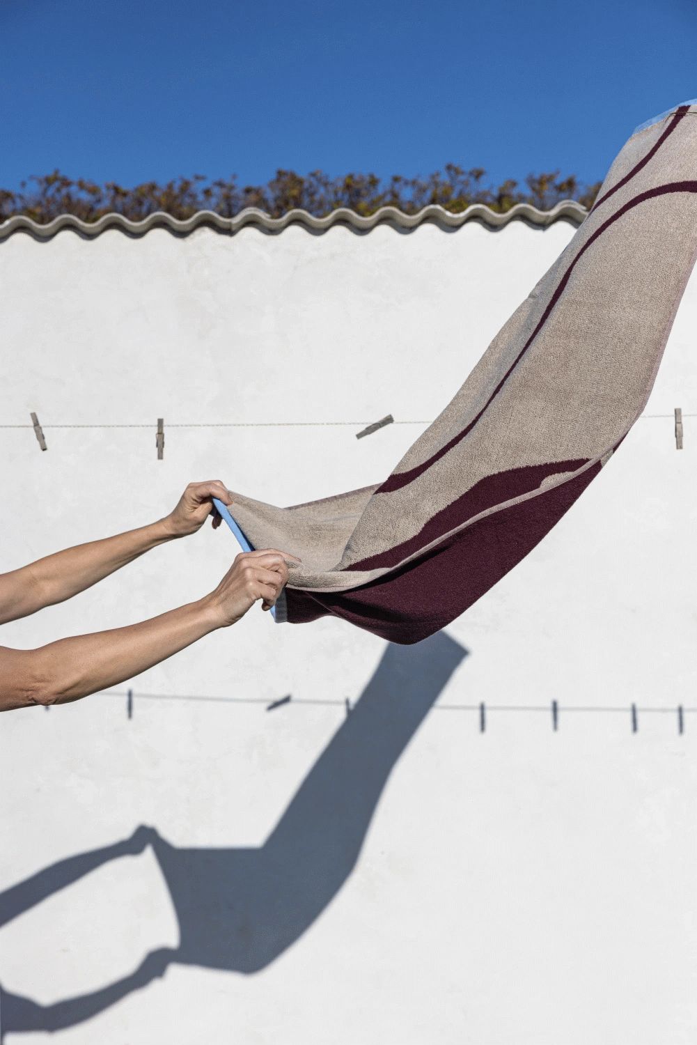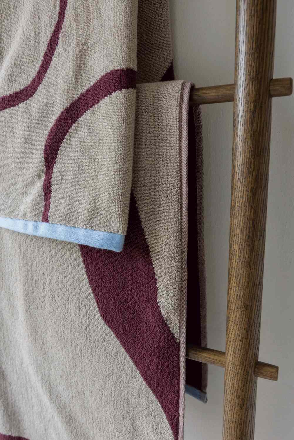 Svøb dig i kunstnerisk komfort med NOVA ARTE badehåndklædet i wine red/sand. Designet viser vinrøde penselstrøg på en sandfarvet baggrund, afsluttet med lyseblå kanter, der tilfører en diskret kontrast. Det abstrakte udtryk og de varme farver giver håndklædet et elegant og nutidigt præg. Fremstillet i 100% økologisk bomuld for høj sugeevne og vedvarende blødhed. For bedste resultat anbefales det at lægge håndklædet i blød i koldt vand i 24 timer før første vask. OEKO-TEX® standard 100-certificeret.Vaskes ved 60° C, tørretumbles ved maksimal varme, undgå skyllemiddel.Længde: 133 cm