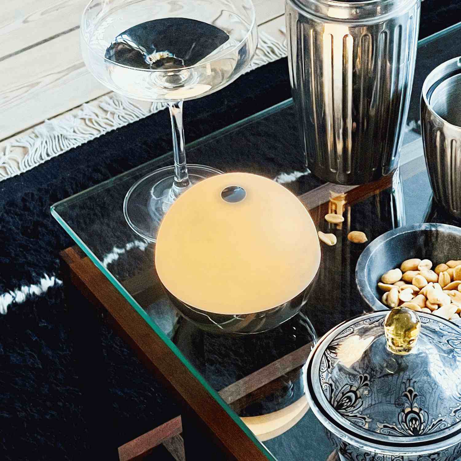 Lampen er designet med brugervenlighed i fokus. Den intuitive touch-funktion i toppen gør det nemt at skifte mellem tre forskellige lysstyrker, så du altid kan tilpasse belysningen efter situationen. Har du brug for blødt stemningslys til en hyggelig aften, eller ønsker du kraftigere belysning til mere praktiske formål, kan du justere intensiteten med et enkelt tryk. Den medfølgende fjernbetjening giver dig mulighed for at styre lyset på afstand, hvilket er særligt praktisk, når lampen placeres på barbordet, terrassen eller som en dekorativ detalje på det smukt dækkede bord.