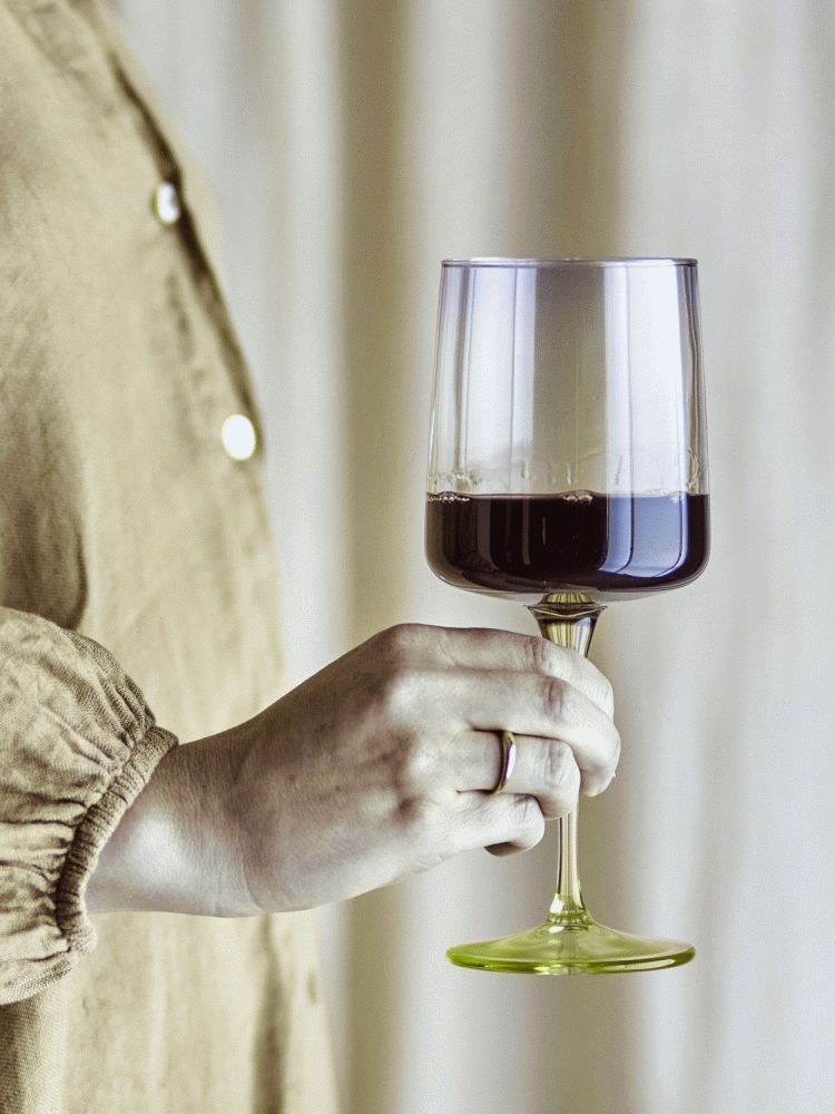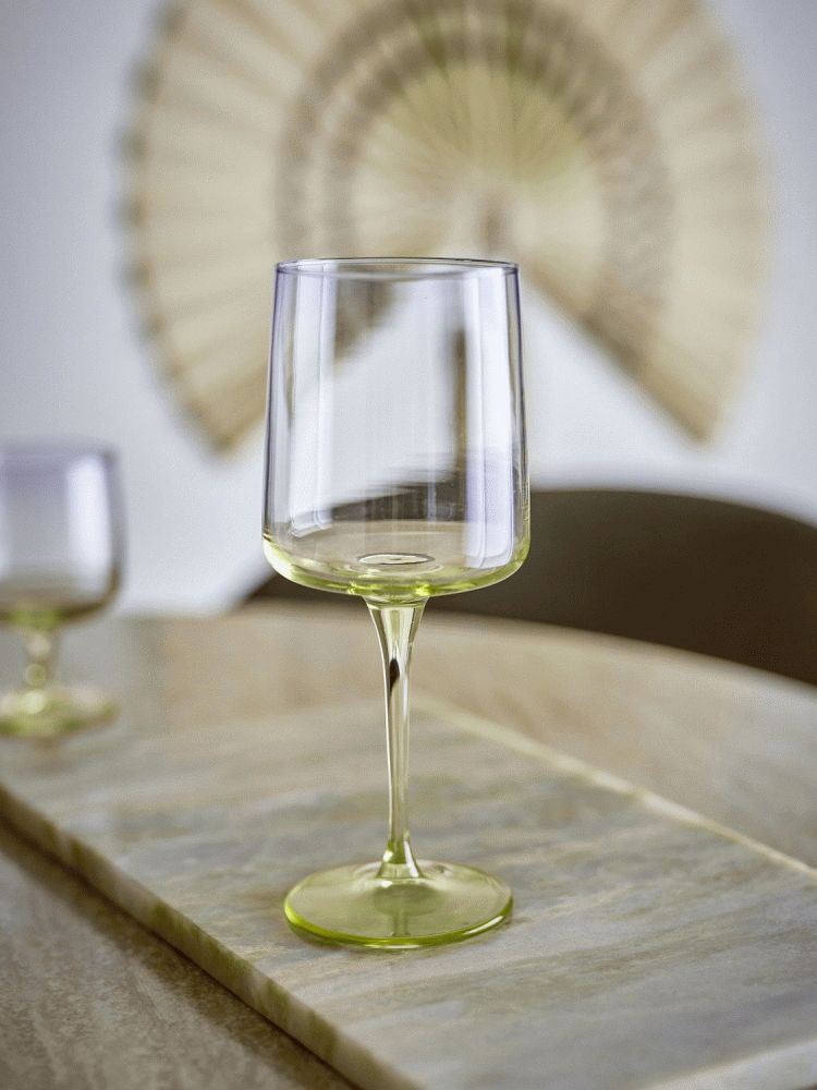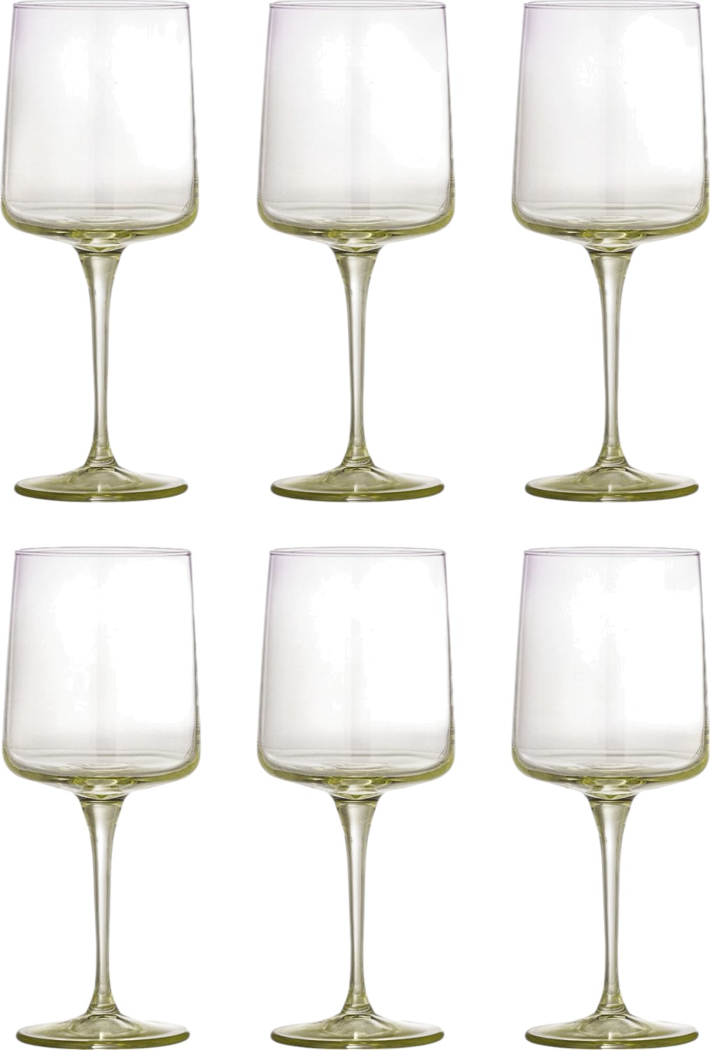 Settet består af seks vinglas, der hver især kombinerer det klare glas med gyldengrønne stilke. Denne kontrast mellem det transparente glas og de varme, gyldne toner i stilkene giver en harmonisk balance, der passer perfekt ind i både moderne og klassiske indretninger. De bløde farver skaber en afstemt og indbydende atmosfære ved bordet, uanset om du dækker op til en afslappet middag eller en mere fornem begivenhed.