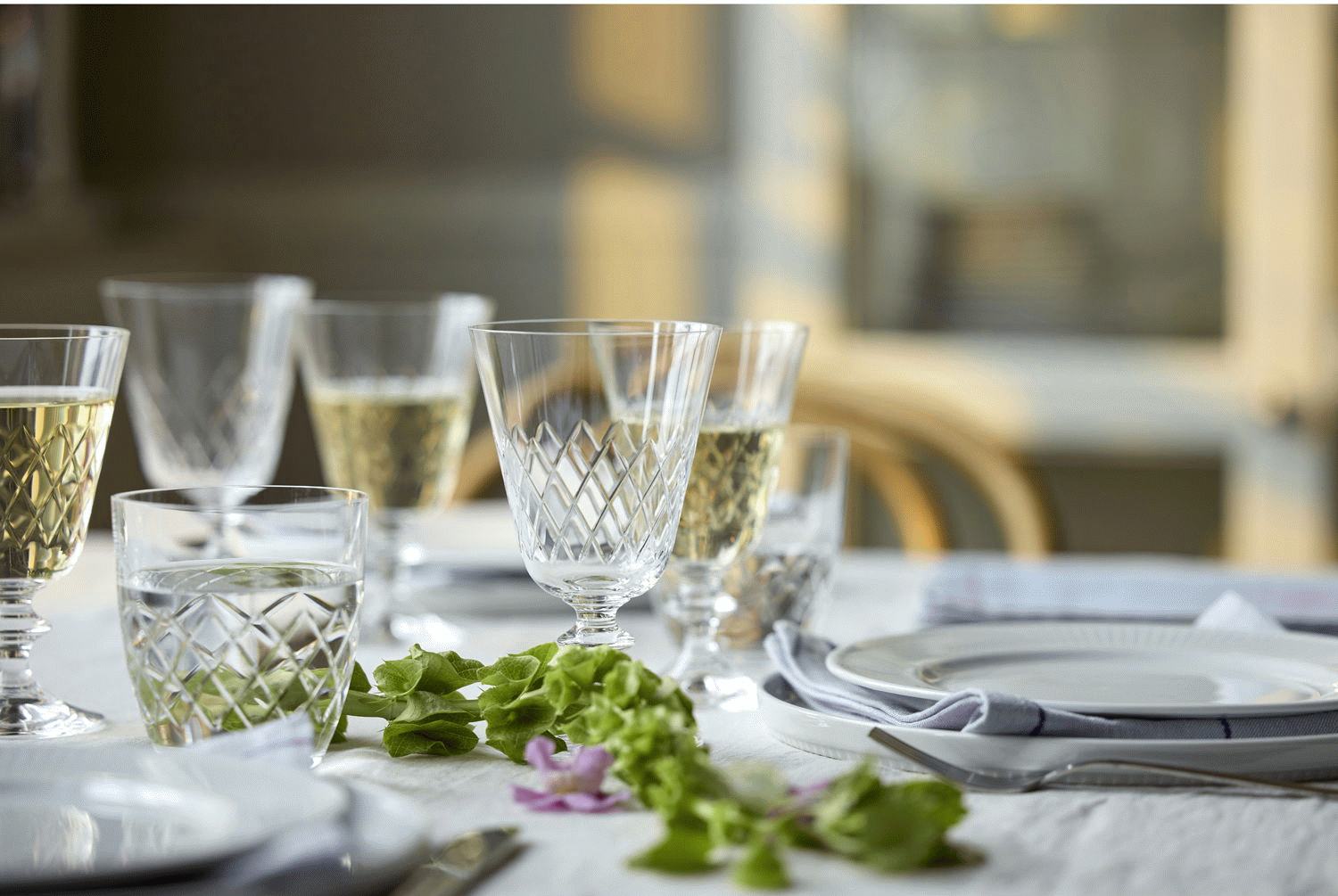 Fremstillet i krystalglas udmærker Eaton-serien sig ved sin enestående klarhed og robuste kvalitet. Materialet sikrer, at glasset tåler daglig brug og samtidig bevarer sin visuelle skønhed gennem mange år. Det rudeformede mønster giver ikke blot en dekorativ dimension, men også et behageligt greb, der gør glasset let at håndtere.