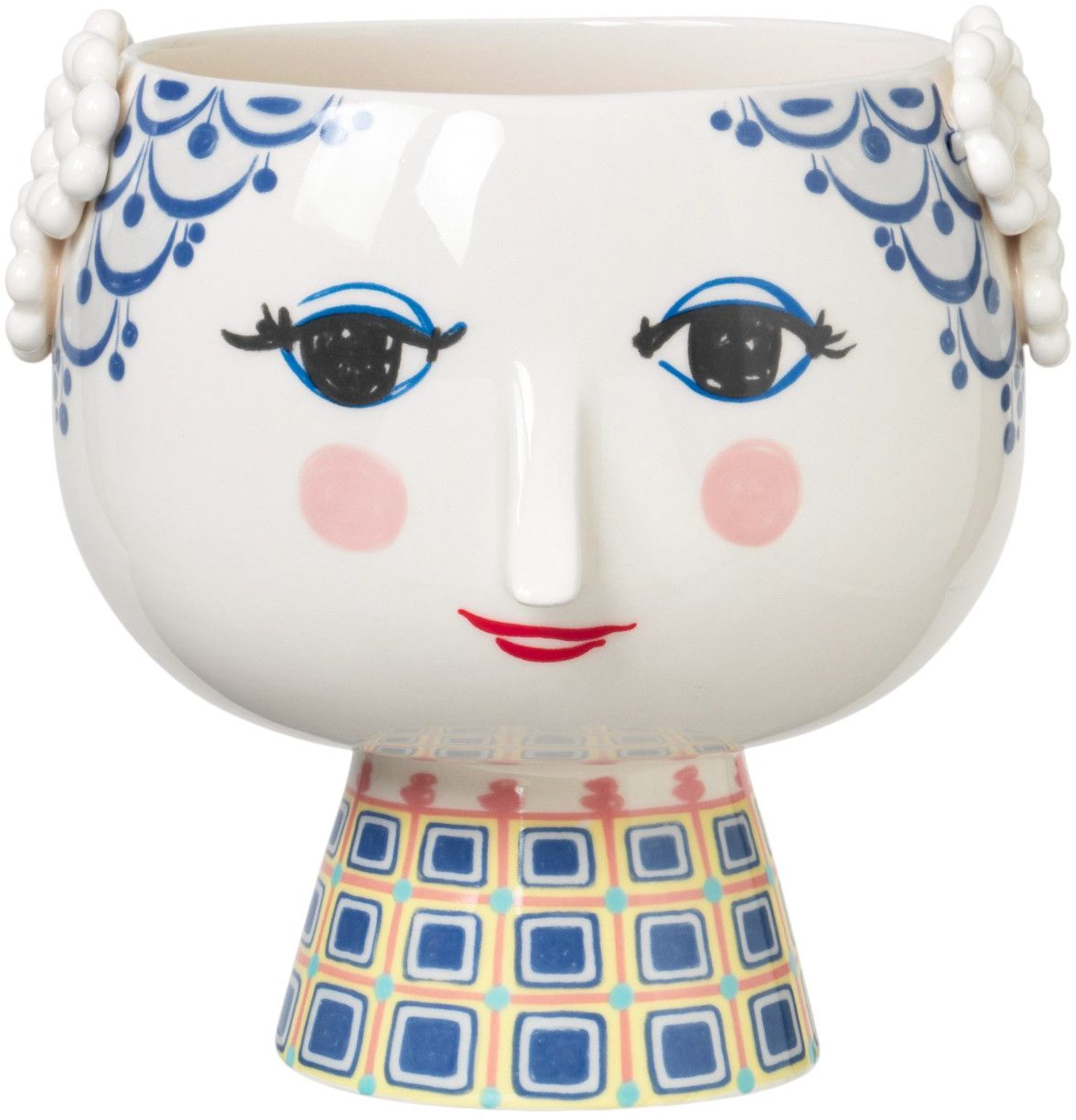 Bjørn Wiinblads ikoniske design kommer til live i denne charmerende Eva urtepotteskjuler på fod i blå nuancer. Den karakteristiske feminine figur med det delikate ansigt og det smilende udtryk tilfører ethvert rum en kunstnerisk dimension og et strejf af klassisk dansk designhistorie. Urtepotteskjuleren kombinerer perfekt funktion med æstetik og gør den til et fremragende valg for både plantentusiaster og samlere af skandinavisk keramikkunst.Denne Eva urtepotteskjuler har en elegant kegleformet krop, der er inspireret af Wiinblads originale Eva-vaser. Den blanke glaserede keramik fremhæver de smukke blå nuancer og de farverige detaljer, som er så kendetegnende for Bjørn Wiinblads unikke stil. Kjolemønstret er en moderne fortolkning af kunstnerens illustrationer, mens ansigtets fine streg bevarer den autentiske charme fra Wiinblads oprindelige design.
