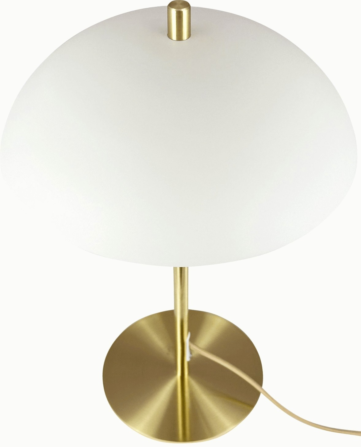 Lampens gennemtænkte konstruktion med flad fod sikrer stabil placering på bord, skrivebord eller natbord, mens den beige kuppel fordeler lyset jævnt og behageligt i rummet. Den diskrete messingstang tilføjer et raffineret touch, der løfter det samlede udtryk uden at dominere. Med sine kompakte mål på 43,5 cm i højde og 30 cm i diameter finder Globus Bordlampe let sin plads, selv hvor pladsen er begrænset.
