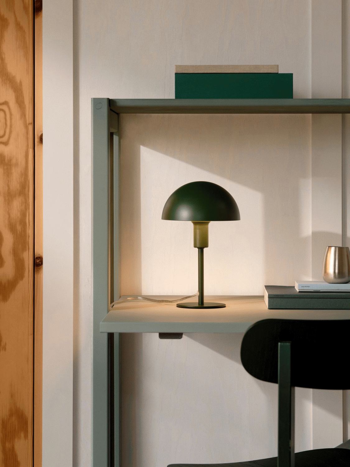 Ellen bordlampen er særligt velegnet til at skabe hyggelig stemning på en hylde, vindueskarm eller natbord. Den kompakte størrelse gør den også oplagt til børneværelset, hvor den kan fungere som en behagelig læselampe eller natlampe. Den mørkegrønne nuance tilføjer personlighed og karakter til rummet uden at dominere indretningen.
