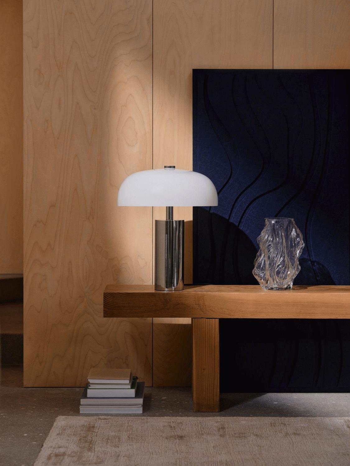 Den store skærm i opalglas er designet til at sprede et blødt og diffust lys, som skaber en behagelig atmosfære i rummet. Lyset fordeles jævnt og uden hårde skygger, hvilket gør Gabrielle velegnet til brug på skrivebordet, sengebordet eller som stemningsskabende belysning i stuen. Den blanke kromfod danner en elegant kontrast til det matte opalglas og bidrager til lampens moderne og stilfulde udtryk.