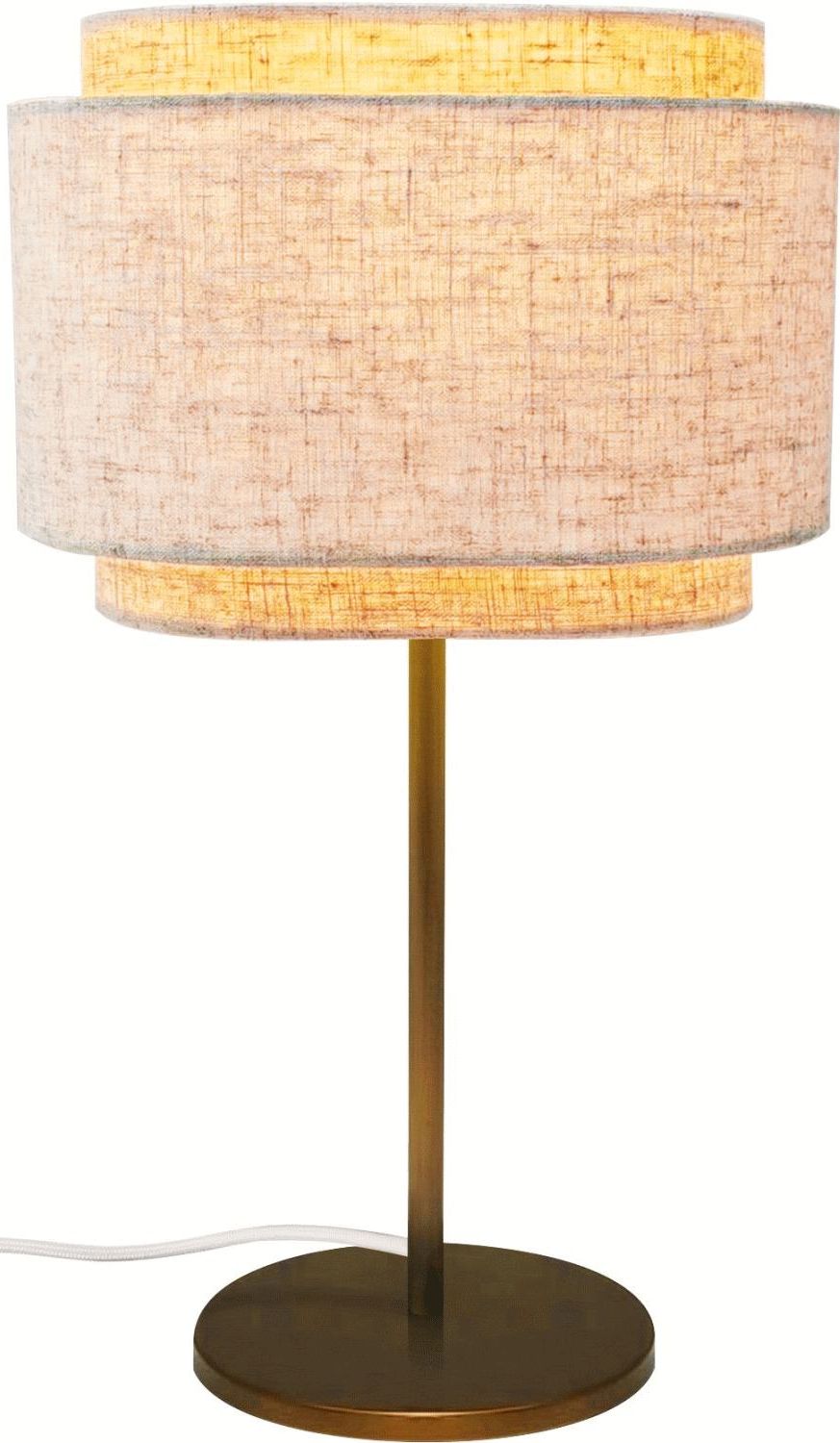 Skærmen er fremstillet i hør, et naturligt tekstilmateriale, der giver lyset en blød og varm karakter. Når lampen tændes, spreder den et behageligt lys, der skaber en hyggelig atmosfære i stuen, soveværelset eller på kontoret. Den brunerede messingfod tilføjer et elegant touch og står i smuk kontrast til den lyse skærm. Denne kombination af materialer giver lampen et tidløst udtryk, der passer ind i både moderne og klassiske indretninger.