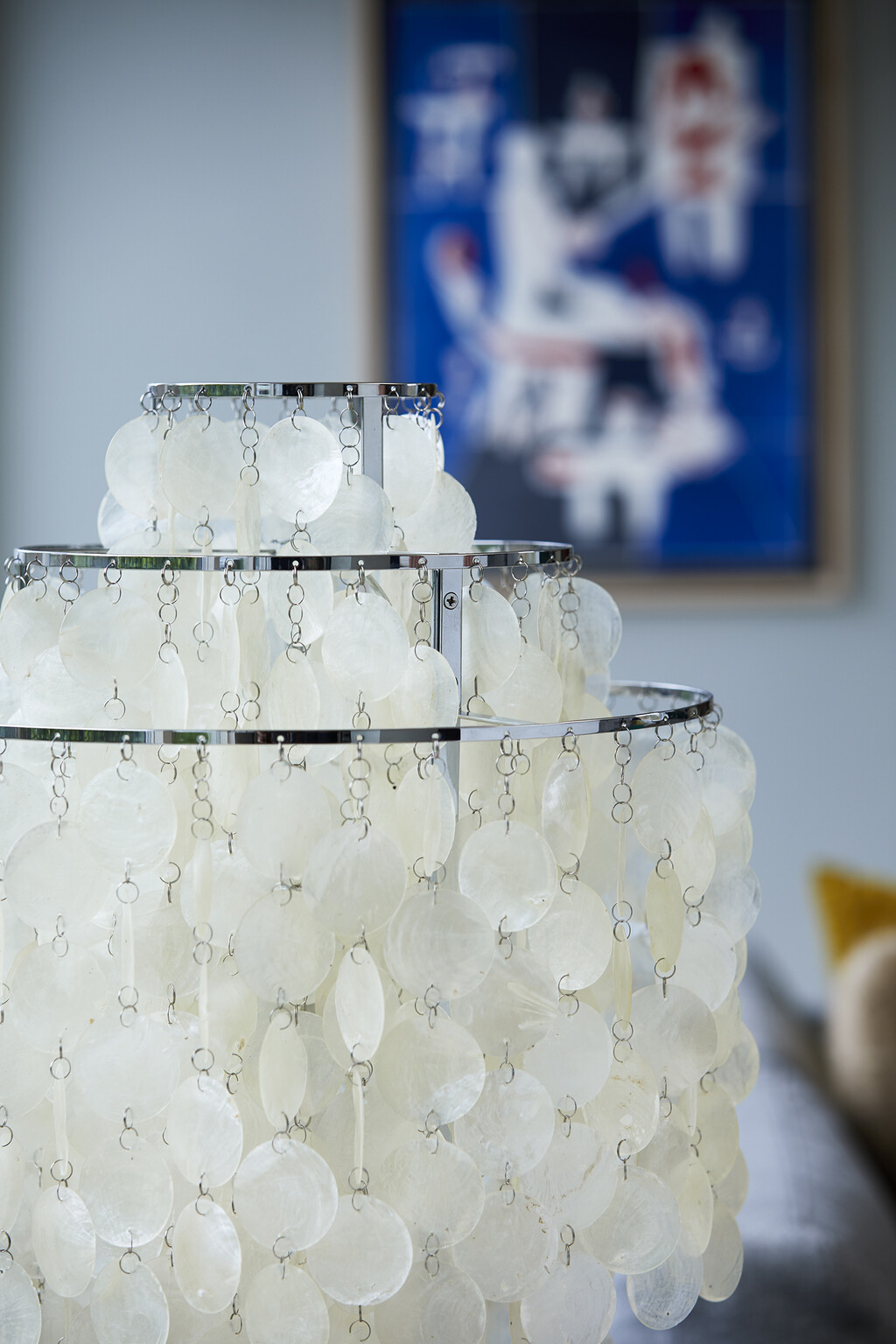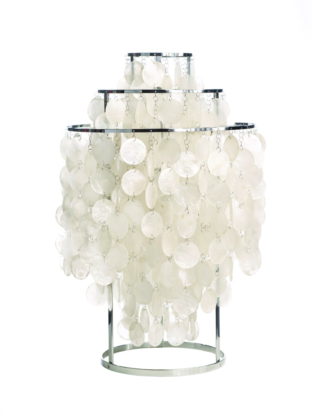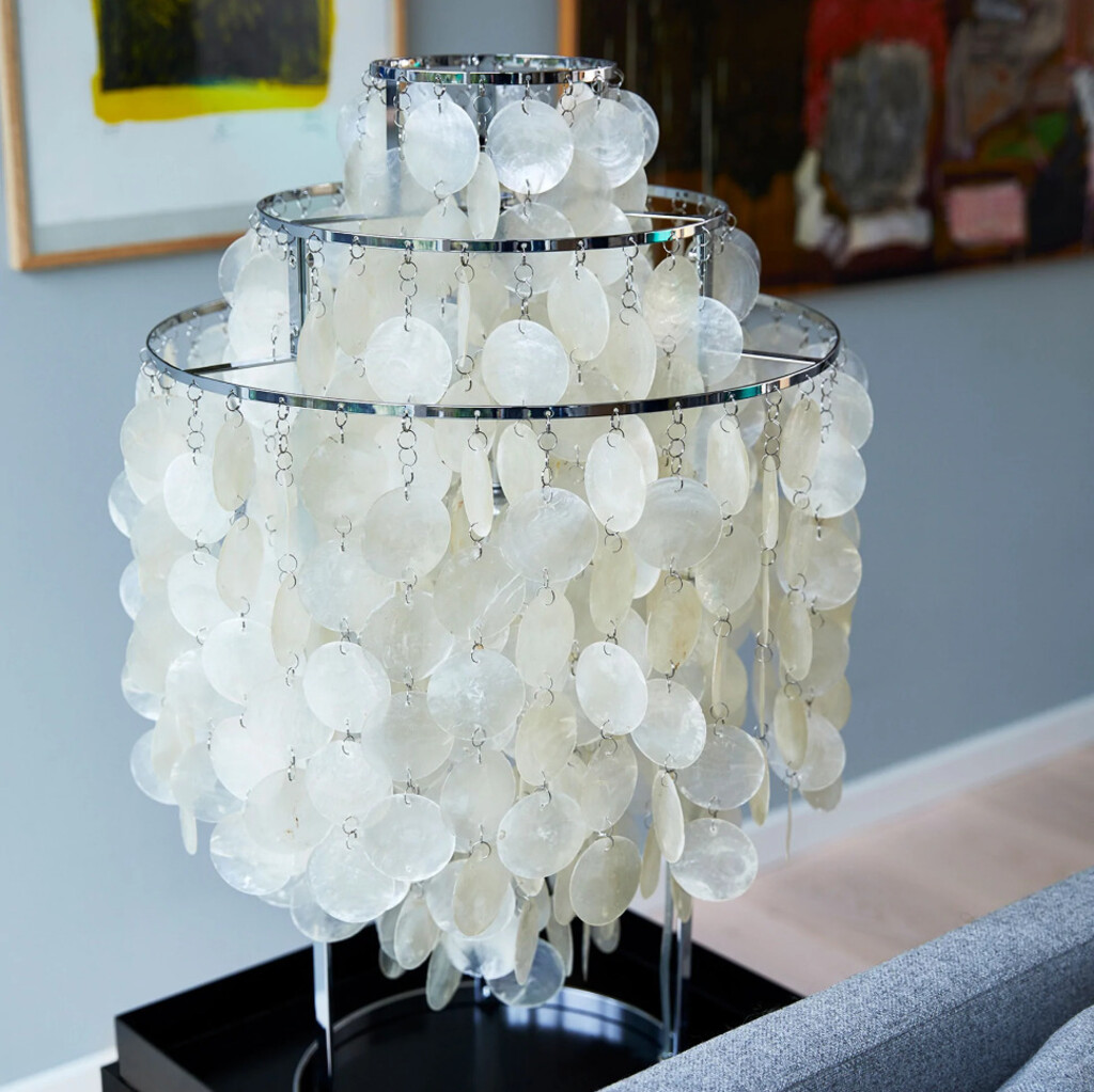 FUN 1TM er er en stor bordlampe med krom stel og muslingeskaller.Mange betragter FUN serien som en af Verner Pantons største mesterværker indenfor belysningsdesign. FUN lamperne afgiver et blødt og naturligt lys, og de lette og sarte muslingeskaller bidrager desuden med bevægelse og lyd, og skaber et helt specielt samspil med omgivelserne.