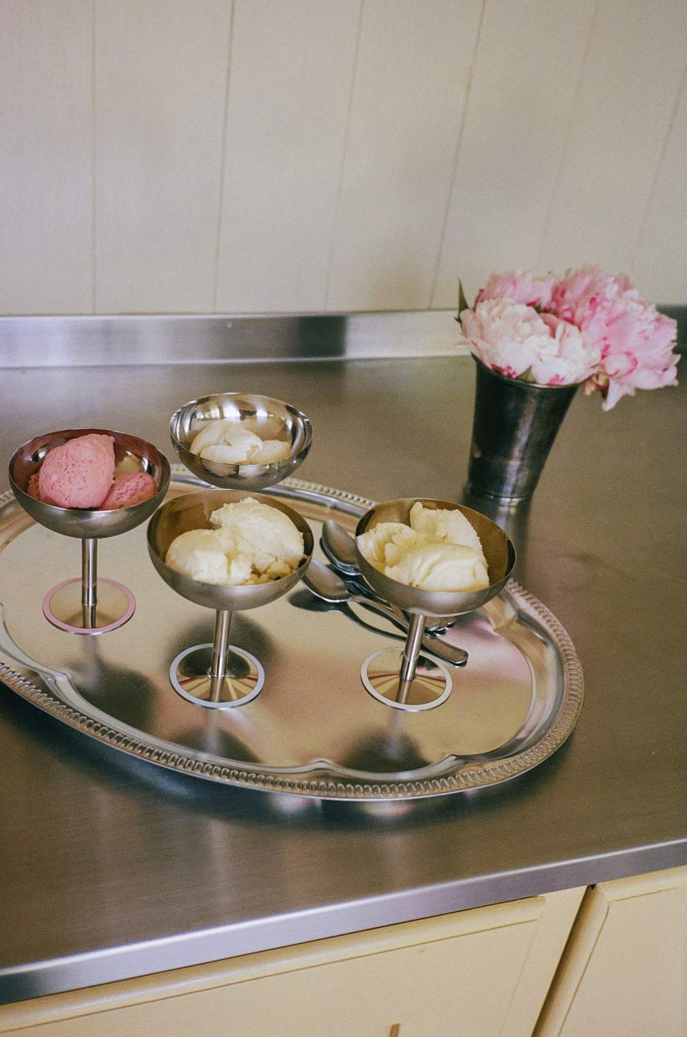 - Elegant dessertskål i rustfrit stål med cremefarvet detalje