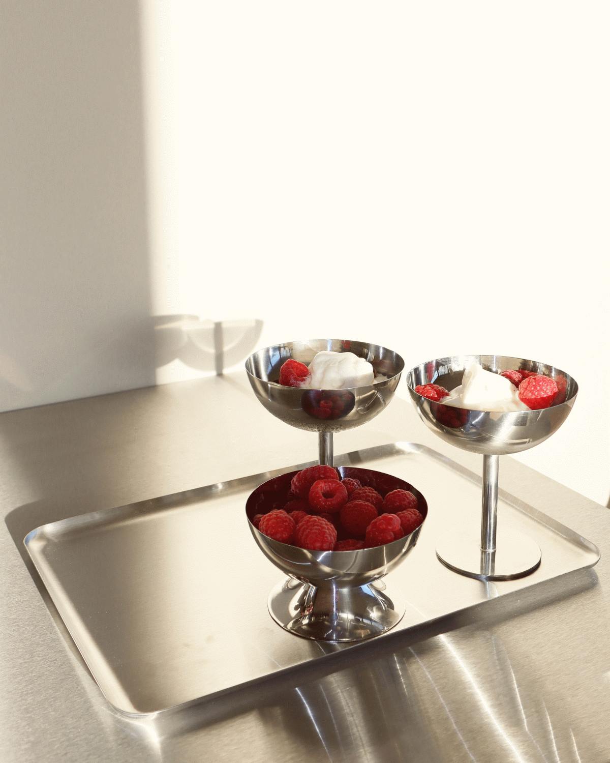 Skålen er ideel til servering af is, sorbet, frisk frugt eller andre lækre desserter. Det polerede stål giver en luksuriøs finish, der tilfører elegance til både hverdagens afslappede stunder og mere festlige sammenkomster. Designet er tidløst og passer til ethvert tabelsetup, uanset om du dækker op til familiemiddag eller arrangerer en større begivenhed.