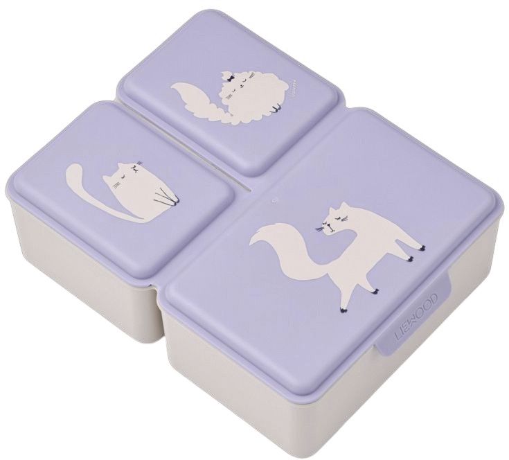 Denne charmerende madkasse fra Liewood kombinerer praktisk funktionalitet med bæredygtig design i det fineste Warm Lilac med søde katte-motiver. Med sine tre separate rum giver Driss madkassen mulighed for at pakke varierede måltider og snacks, så alt holder sig friskt og adskilt hele dagen.Madkassen er fremstillet af 75% genanvendt PET, hvilket gør den til et miljøbevidst valg for moderne familier. Det robuste materiale sikrer, at kassen tåler daglig brug, mens den samtidig forbliver let at håndtere for små hænder. Det gennemtænkte design betyder, at hvert rum kan åbnes individuelt, så børnene nemt kan få adgang til deres mad uden at forstyrre de andre rum.