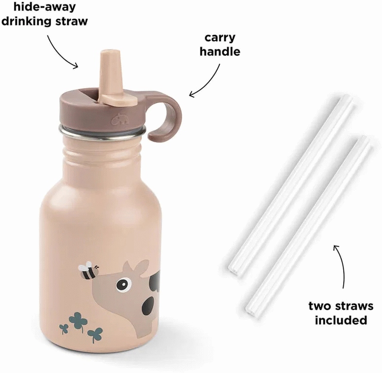 Flasken er udstyret med et skjult sugerør, der forbliver beskyttet mellem brugen. Dette sikrer, at sugerøret holdes rent og hygiejnisk, selv når flasken ligger i tasken eller skoletasken. Den gennemtænkte konstruktion betyder, at børn kan drikke nemt og bekvemt, mens forældrene kan være trygge ved, at flasken lever op til høje standarder for renlighed.